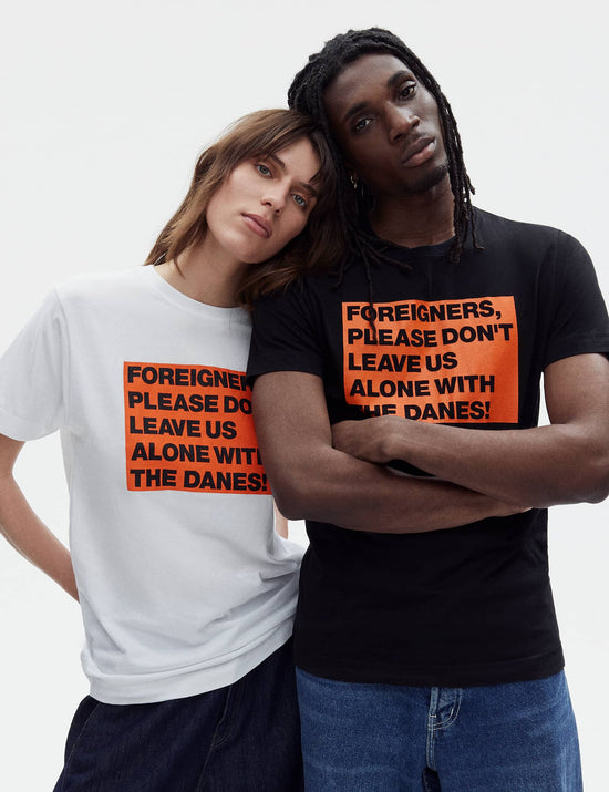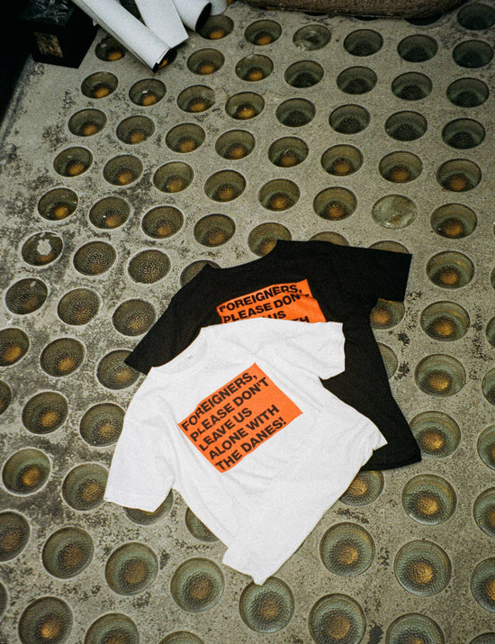 Foreigners, Please Don't Leave Us Alone with the Danes er et centralt værk på den 60. kunstbiennale i Venedig, og det vises samtidig på SMK i København. I den anledning har SUPERFLEX inviteret Mads Nørgaard til at producere en t-shirt med værket trykt på brystet.