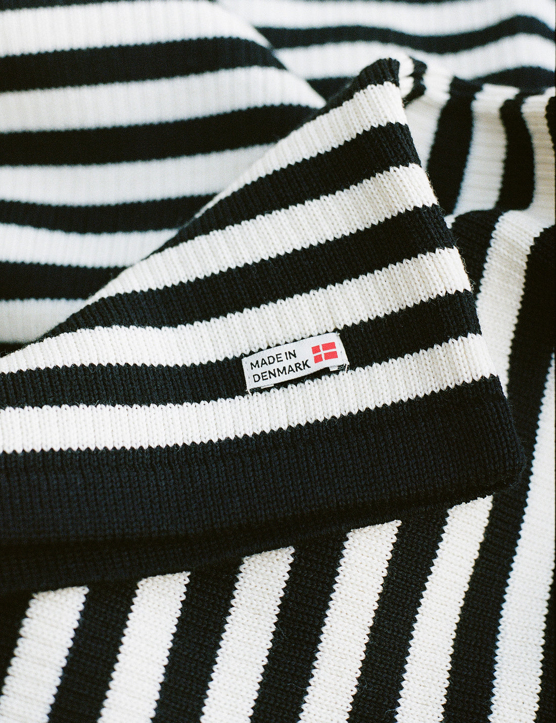 “Vi ønskede at skabe en tidløs strik, der kunne tale til alle køn. Garnet er 100 % merinould, og strikken er inspireret af en vintage militærtrøje med et meget tæt ribmønster. Denne første version er lavet i vores karakteristiske sort/hvide Broadway Strib,” siger Laura Nørgaard og Paw Hansen, som er designere af henholdsvis dame- og herrekollektionen hos Mads Nørgaard - Copenhagen.