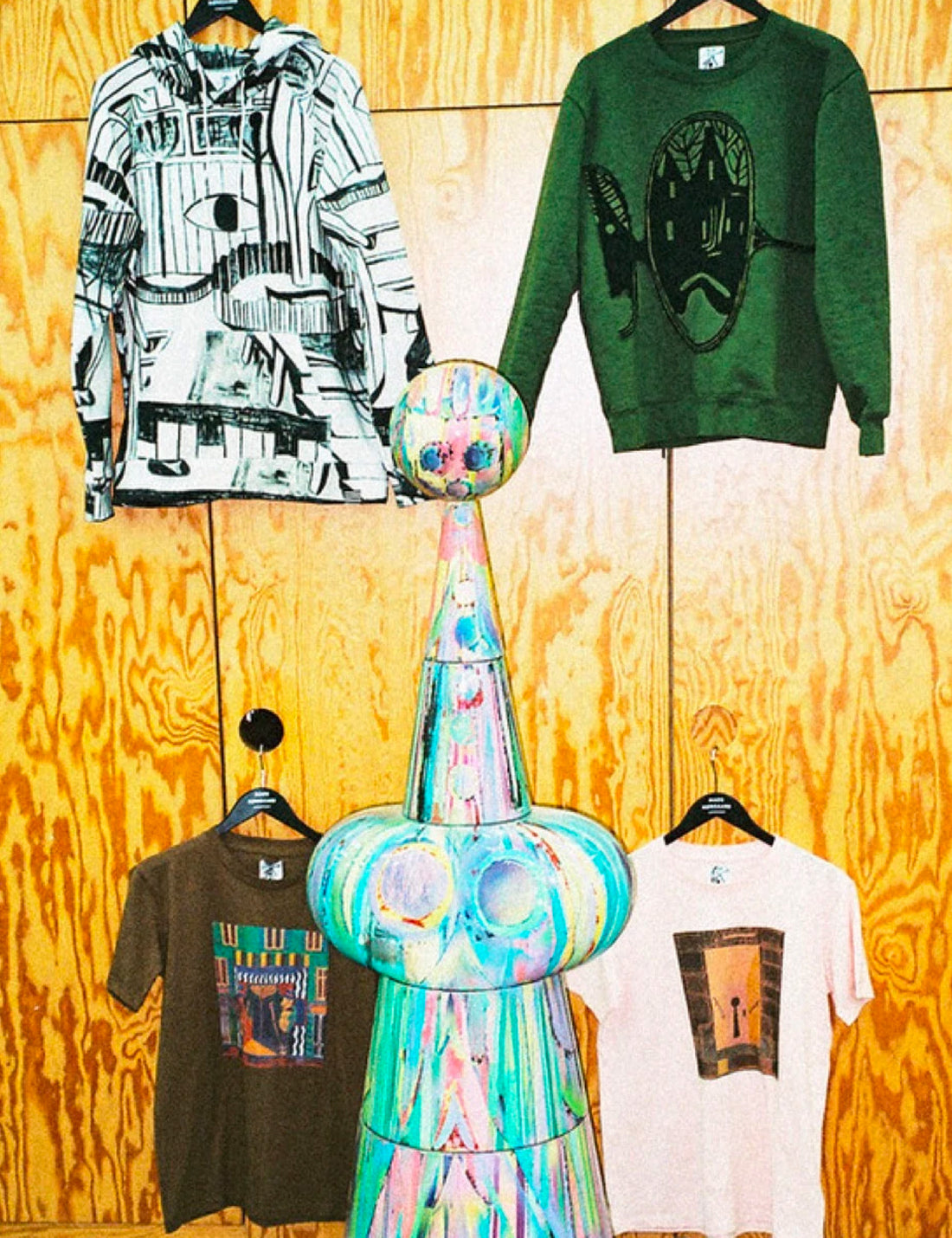 Resultatet af vores kreative møde er en mini-kollektion der består af to t-shirts og to sweatshirts. Alle fire stykker tøj bærer forskellige print fra udstillingen.