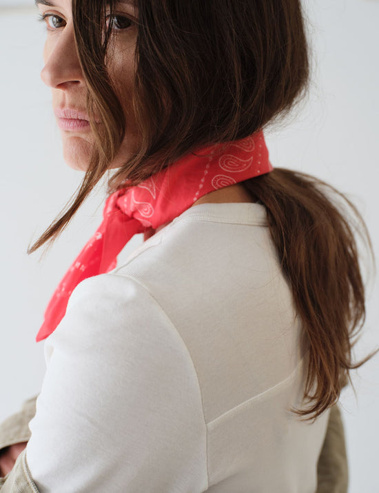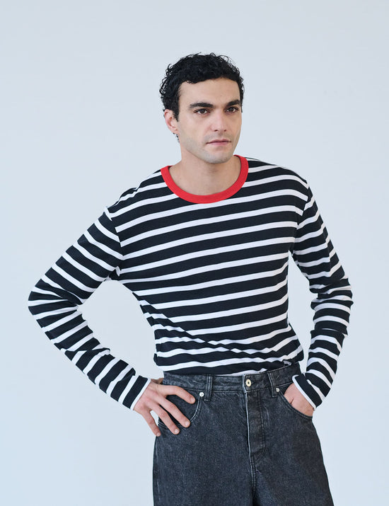 En klassisk t-shirt, som sidder og føles helt rigtigt. T-shirten er skabt af langfibret bomuld af høj kvalitet, som føles blød mod huden og holder formen vask efter vask. Stoffet er strikket hos en af de få tilbageværende familieejede leverandører i Danmark, som med stolthed værner om den lokale strikketradition. T-shirten er designet med et twist i detaljen, farven eller striben.
