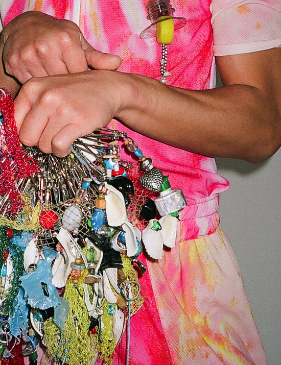 Hvert sæt – t-shirt og shorts – er med farvestrålende prints fra Rists værker og dekoreret med unikke, håndlavede vedhæng af perler, kapsler, fiskenet og andre strandfund, så du aldrig er alene i vandet. Deraf titlen You’ll Never Swim Alone.