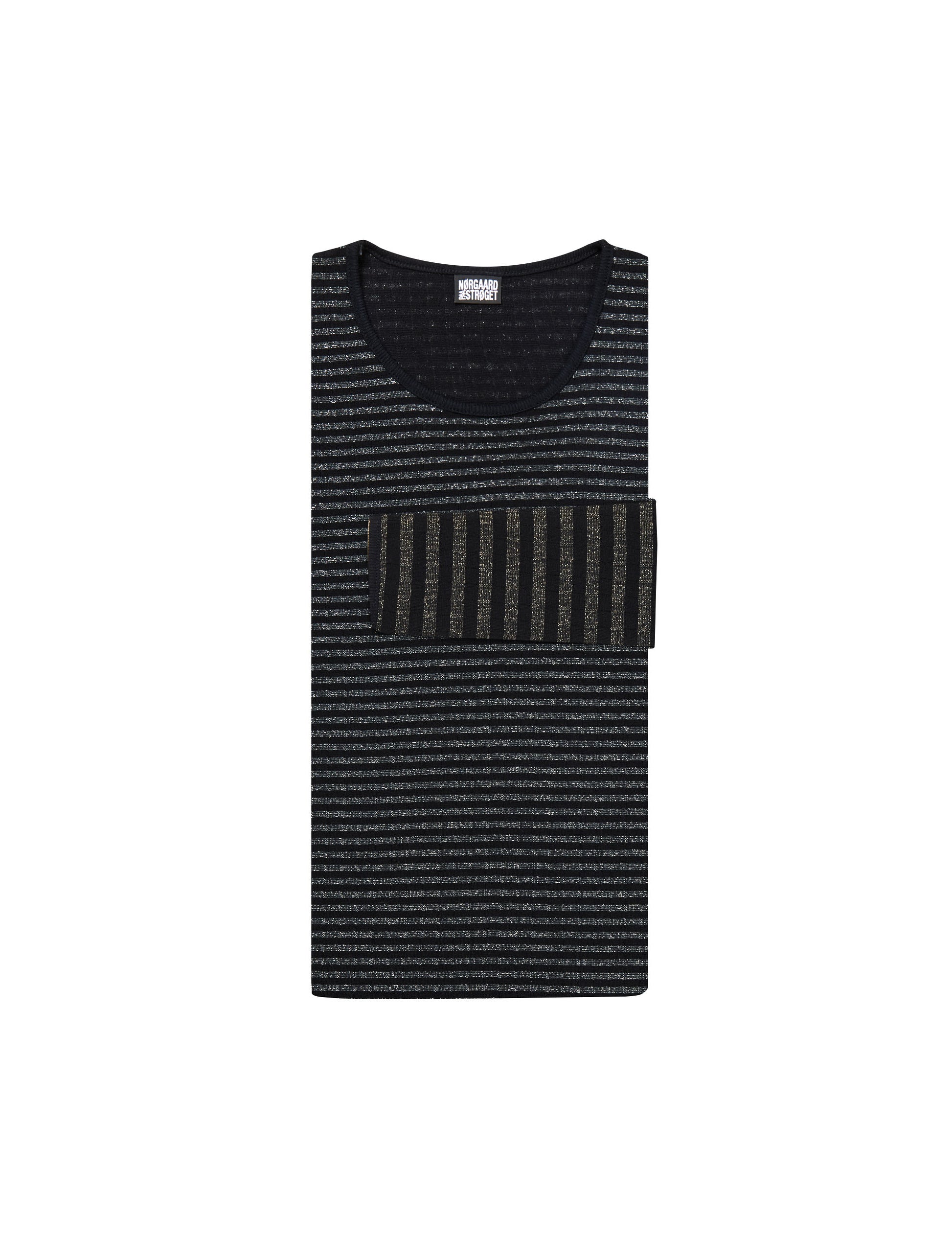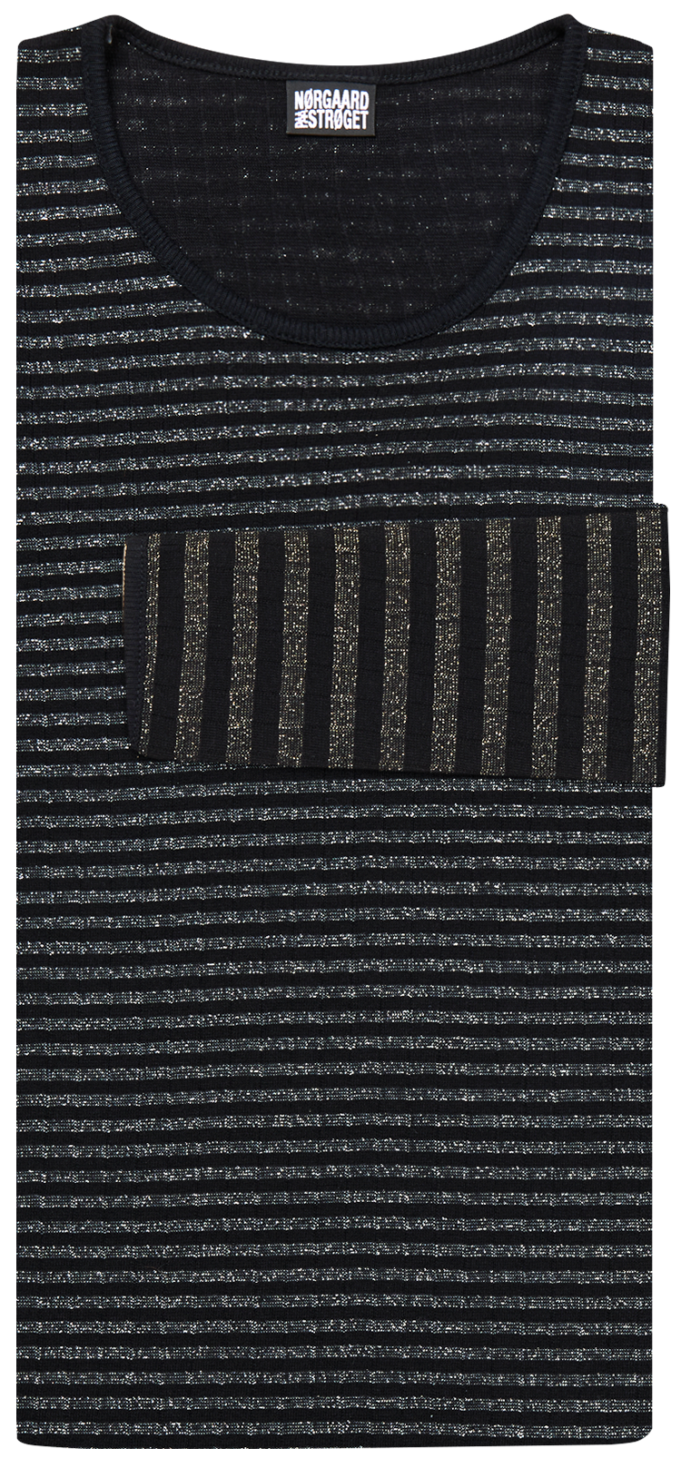 101 Glam Blok er vores #101 T-shirt i glitter. Ærmerne er i Broadway i sort og guld og kroppen er Fine Stripe i sort og sølv. Nørgaard paa Strøgets #101 T-shirt er designet i 1967 af Jørgen Nørgaard. T-shirten er strikket, farvet og syet i Danmark og lavet i 92% Cotton 8% Lurex. #101 T-shirten er onesize, men fås i to forskellige længder. Den langærmede T-shirt bliver produceret i tre forskellige varianter og to forskellige længder.
