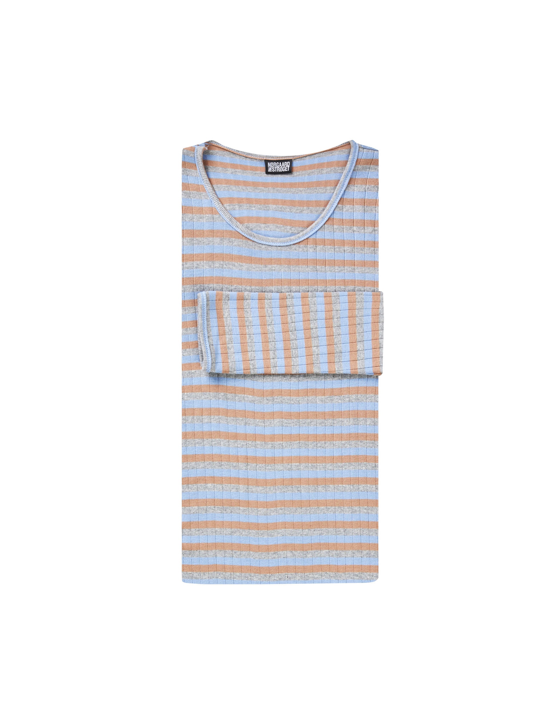 101 Tricolore er den klassiske stribede #101 T-shirt med tre striber. Denne udgave er blå/brun/rose. Nørgaard paa Strøgets #101 T-shirt er designet i 1967 af Jørgen Nørgaard. T-shirten er strikket, farvet og syet i Danmark og lavet i 100% bci bomuld. #101 T-shirten er onesize, men fås i to forskellige længder. Den langærmede T-shirt bliver produceret i tre forskellige slags striber og i alle regnbuens farver.