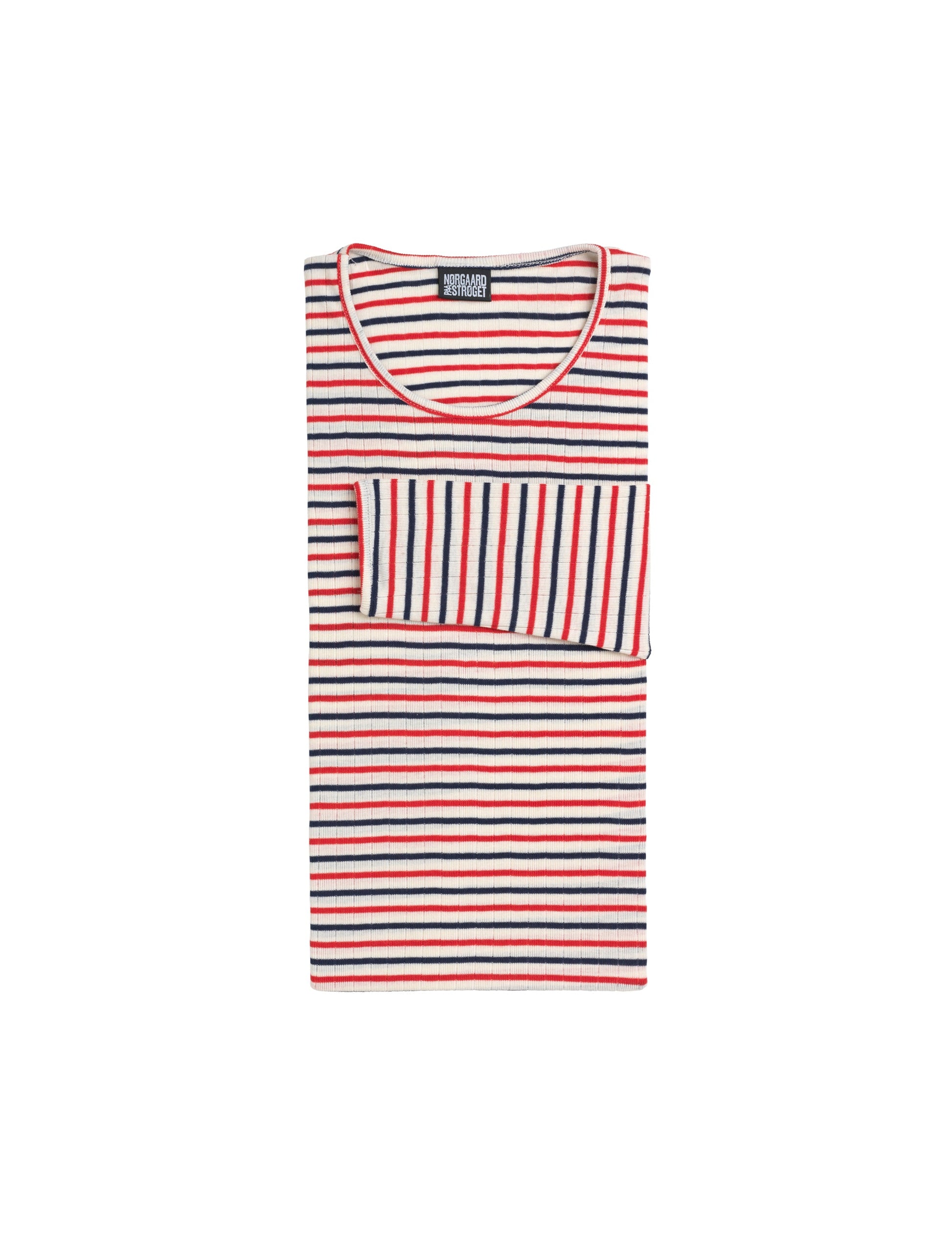 101 Tricolore er den klassiske stribede #101 T-shirt med tre striber. Denne udgave er blå/brun/rose. Nørgaard paa Strøgets #101 T-shirt er designet i 1967 af Jørgen Nørgaard. T-shirten er strikket, farvet og syet i Danmark og lavet i 100% bci bomuld. #101 T-shirten er onesize, men fås i to forskellige længder. Den langærmede T-shirt bliver produceret i tre forskellige slags striber og i alle regnbuens farver.