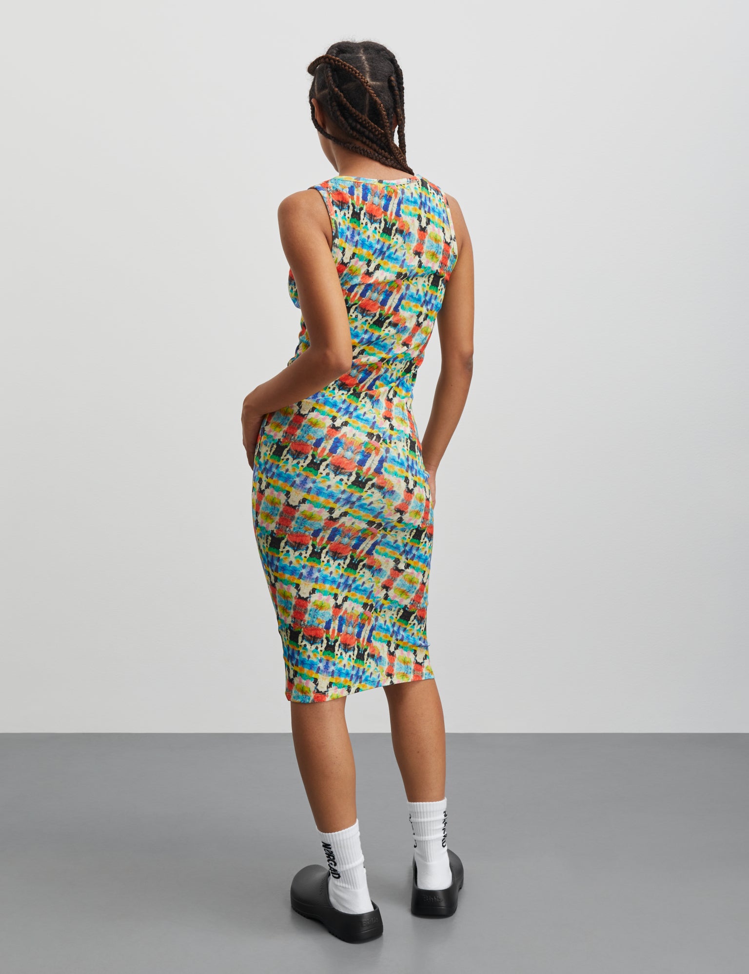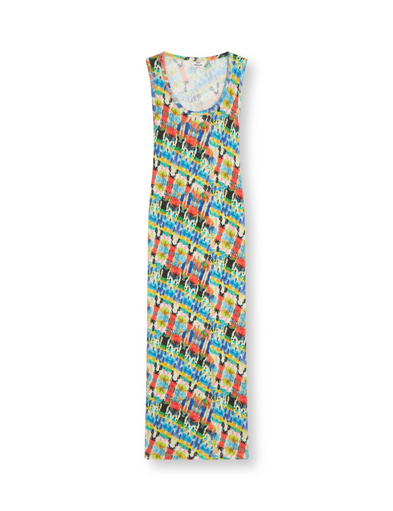 Vores 2x2 Cotton AOP Ama Dress er en tanktop-kjole i meget blød og fleksibel, ribstrikket jersey. Kjolen er superelastisk og har facon som en tætsiddende tanktop, ryggen er høj, og den dybe runde hals og de brede ærmegab er kantet med tynd rib.