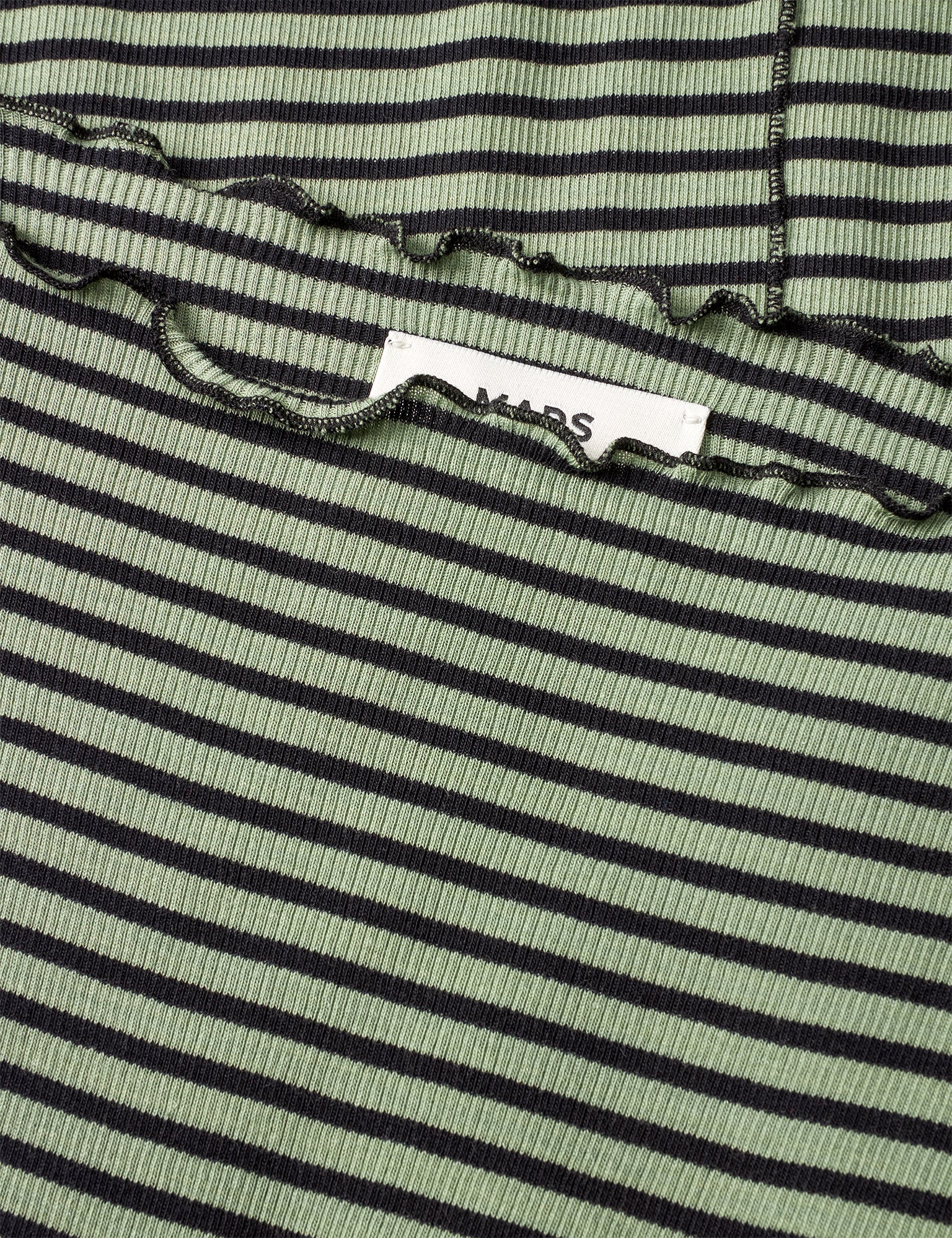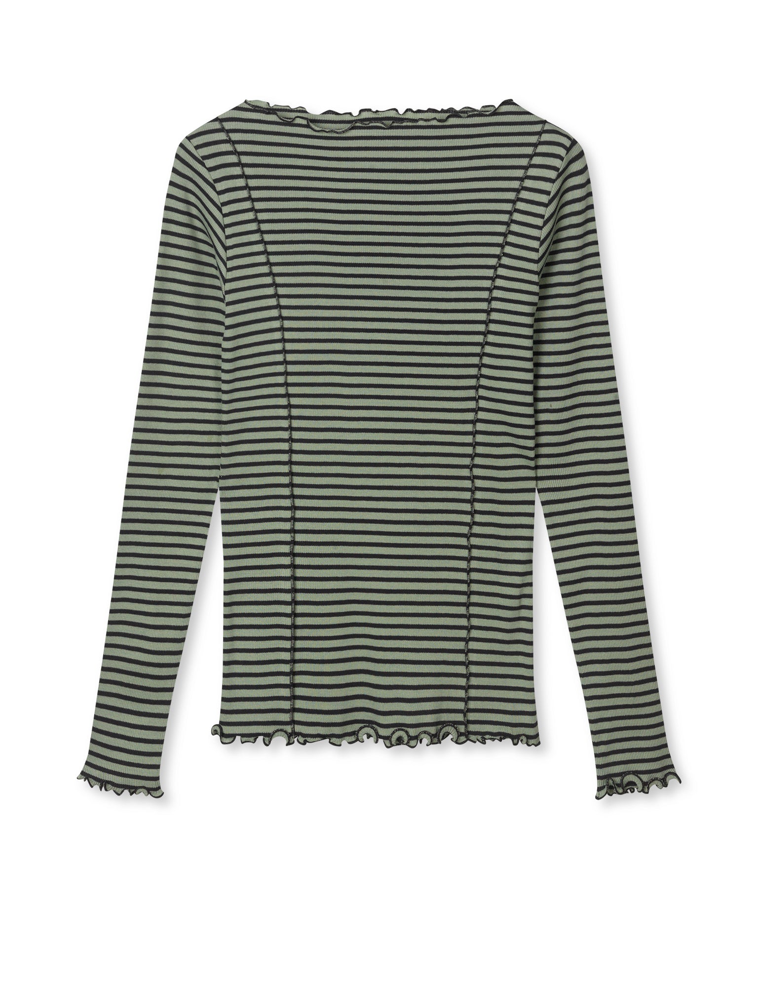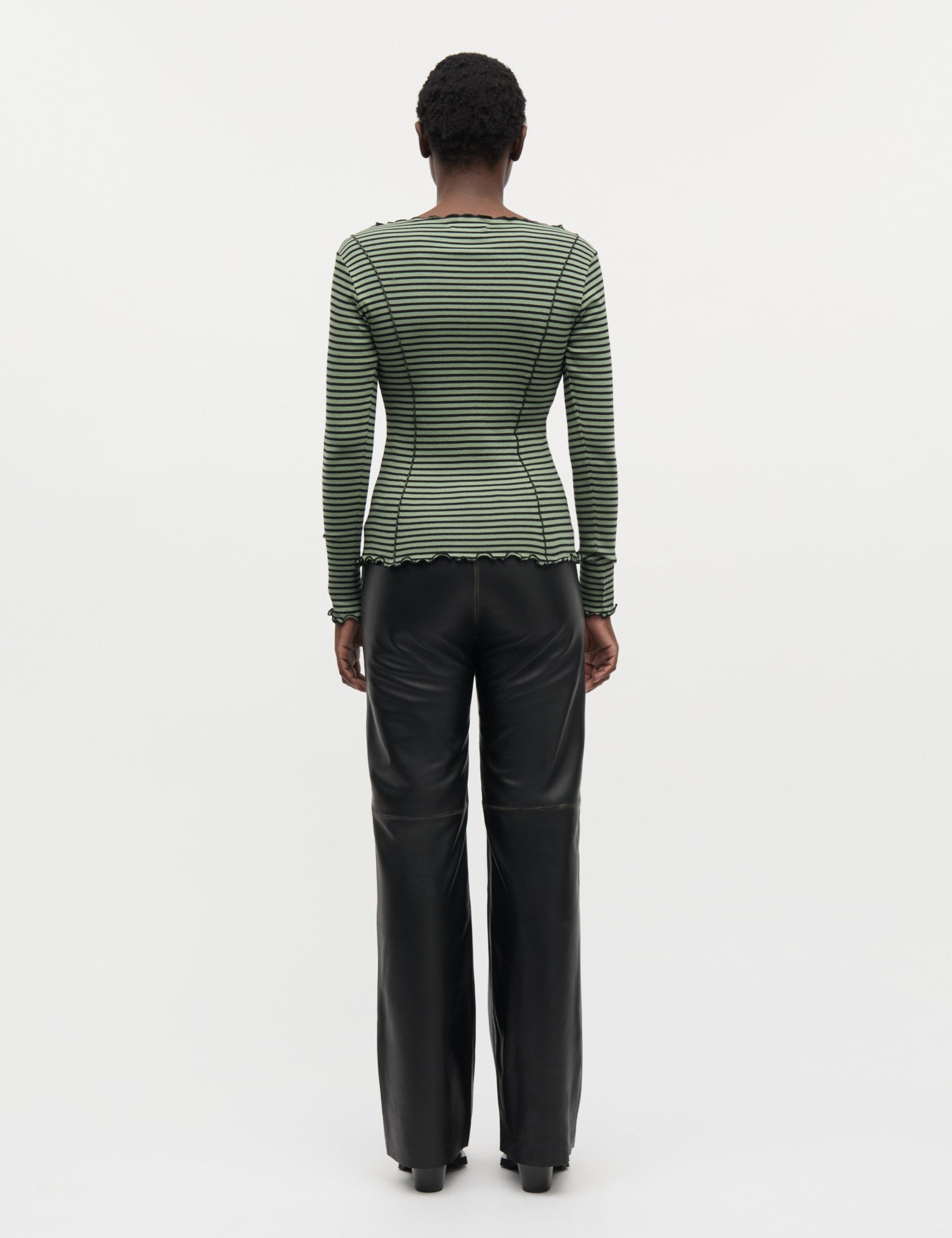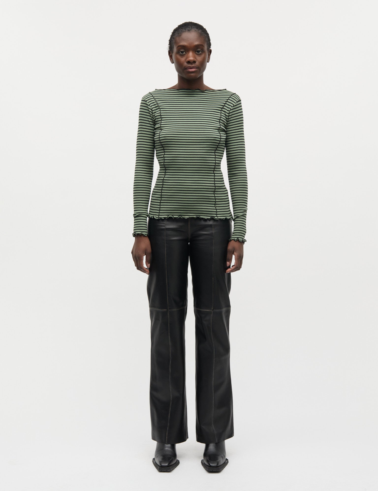Tætsiddende og stretchy langærmet T-shirt med bådudskæring og krøllede kanter.