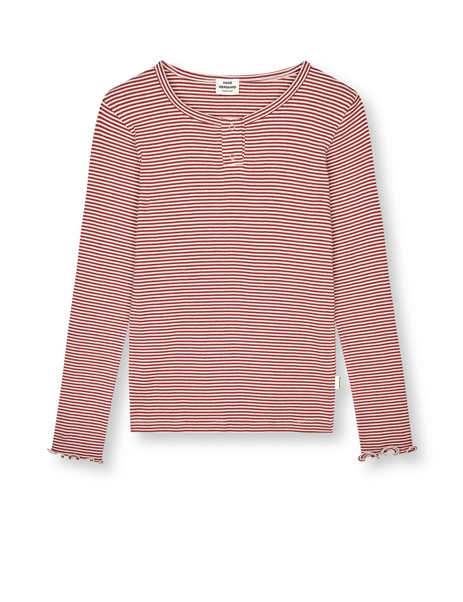 Blød, tætsiddende og stretchy langærmet T-shirt med rund hals og kort stolpelukning med trykknapper.