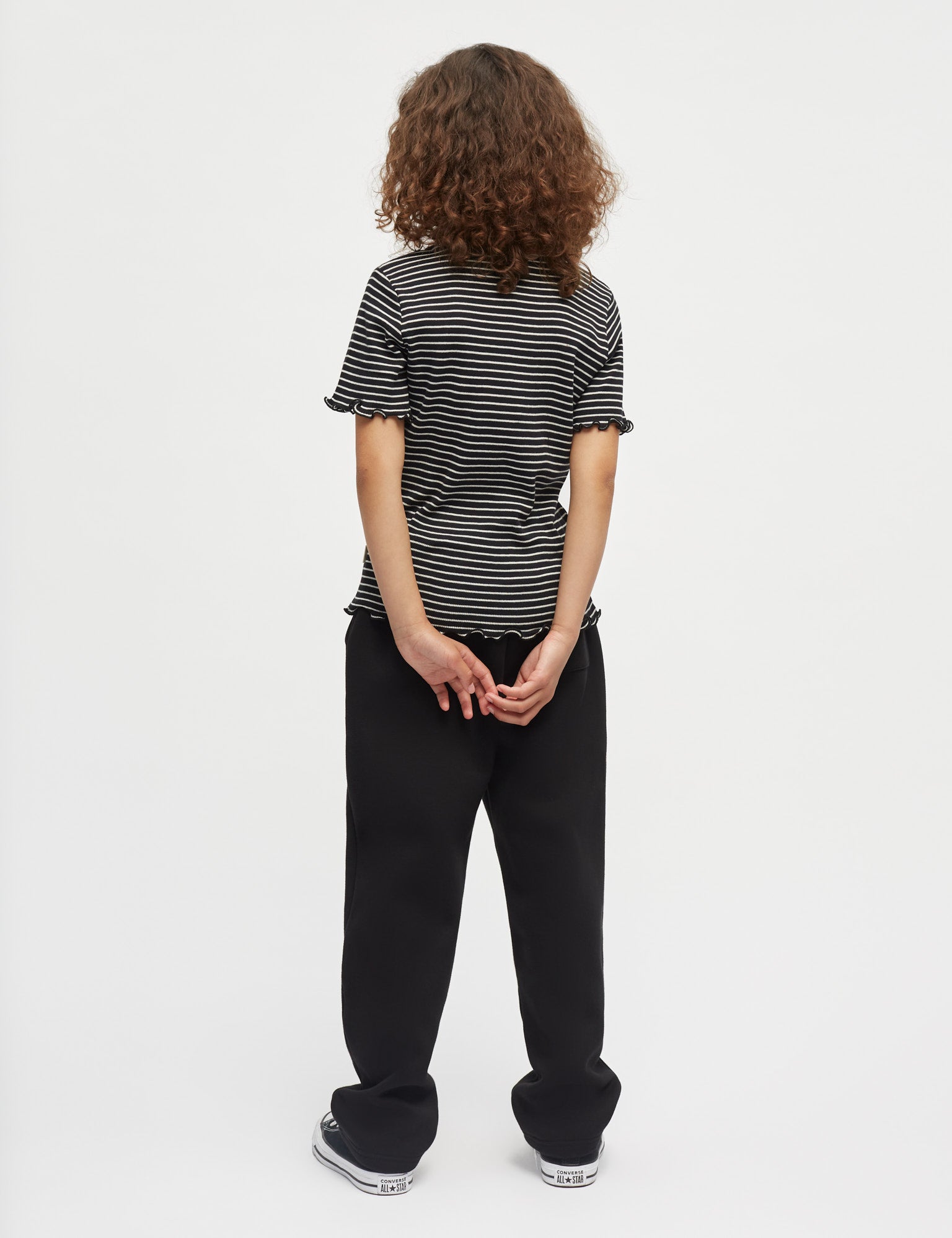 Blød, tætsiddende og stretchy T-shirt med V-udskæring med drapering og bølgede kanter i bunden og ved ærmerne.