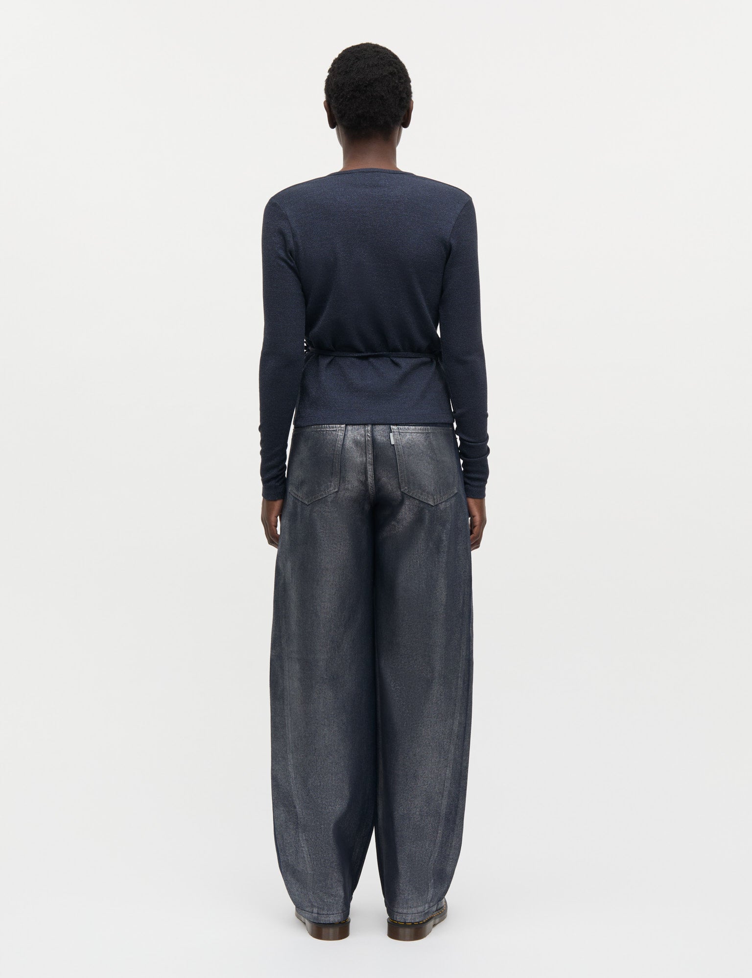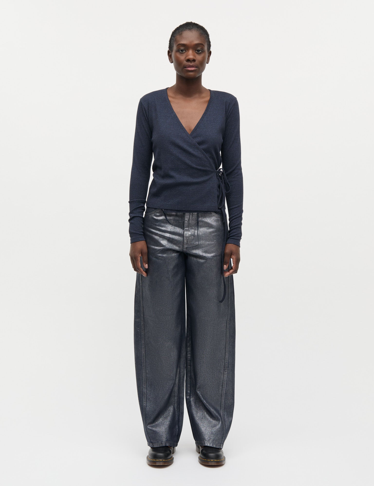 Tætsiddende og stretchy langærmet og cropped slå om-bluse.