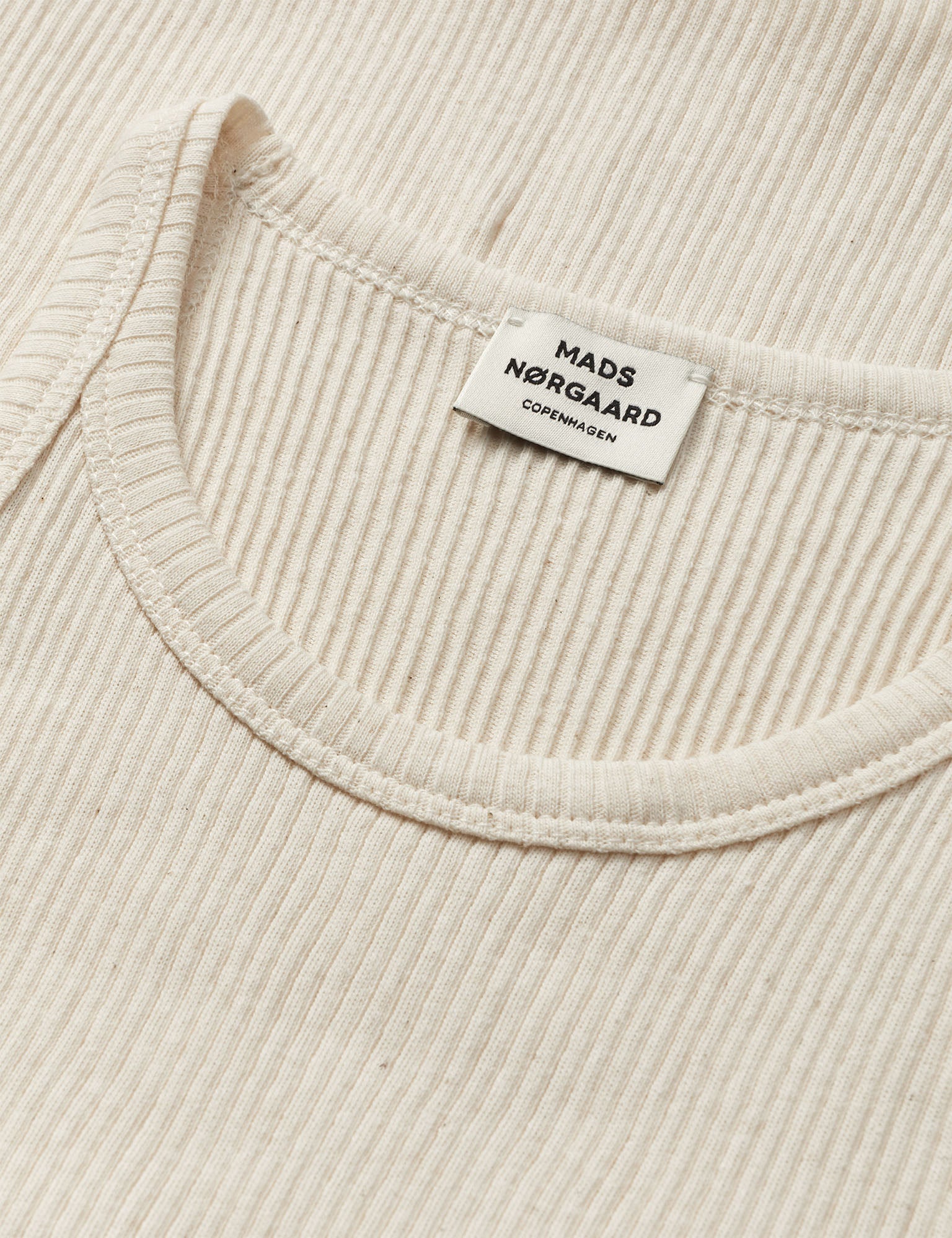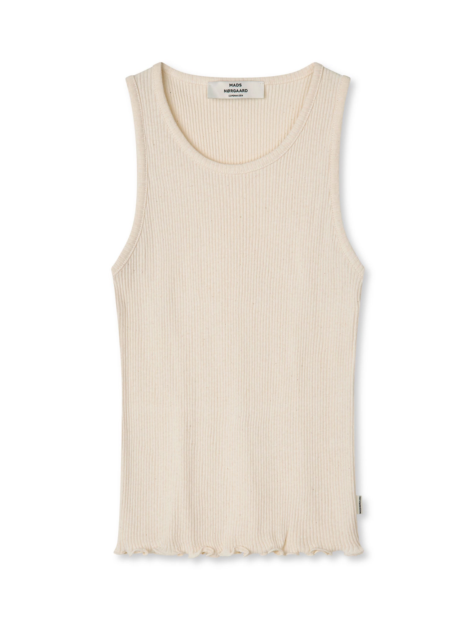 Ribstrikket top med rund hals, smalle stropper og bølgekant i bunden.