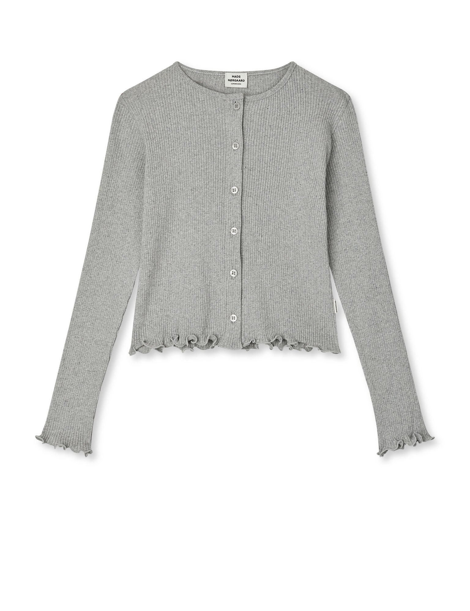 Finstrikket cardigan med små knapper og bølgede kanter i bunden og ved ærmerne.