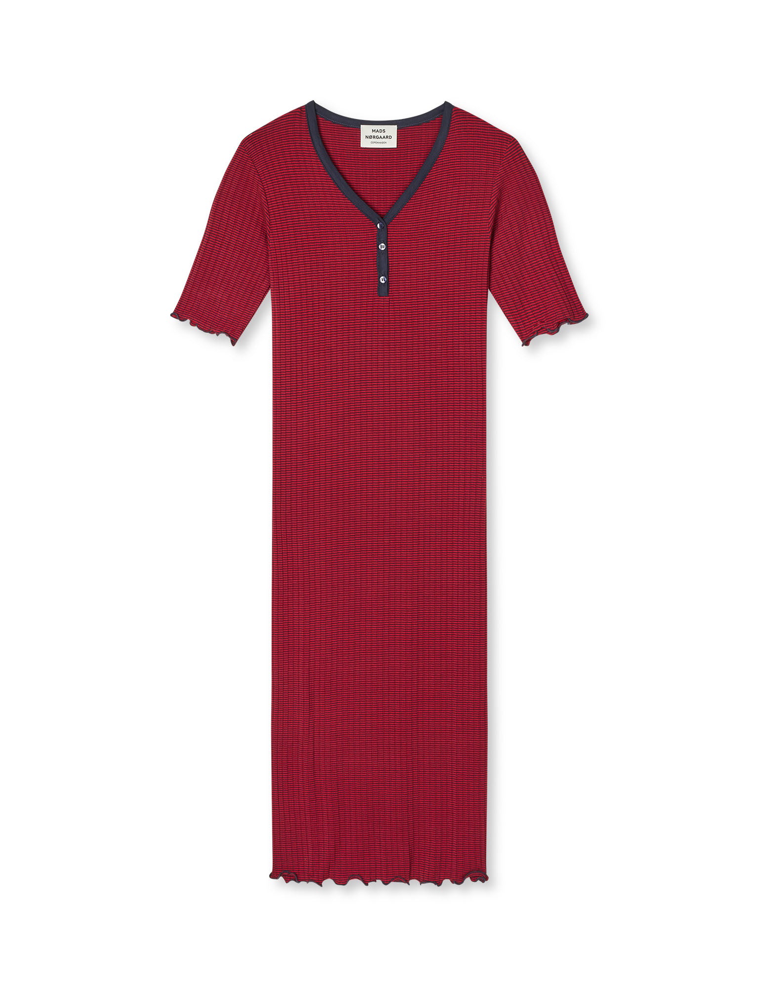 Tætsiddende og læglang T-shirt kjole med V-udskæring og stolpelukning.
