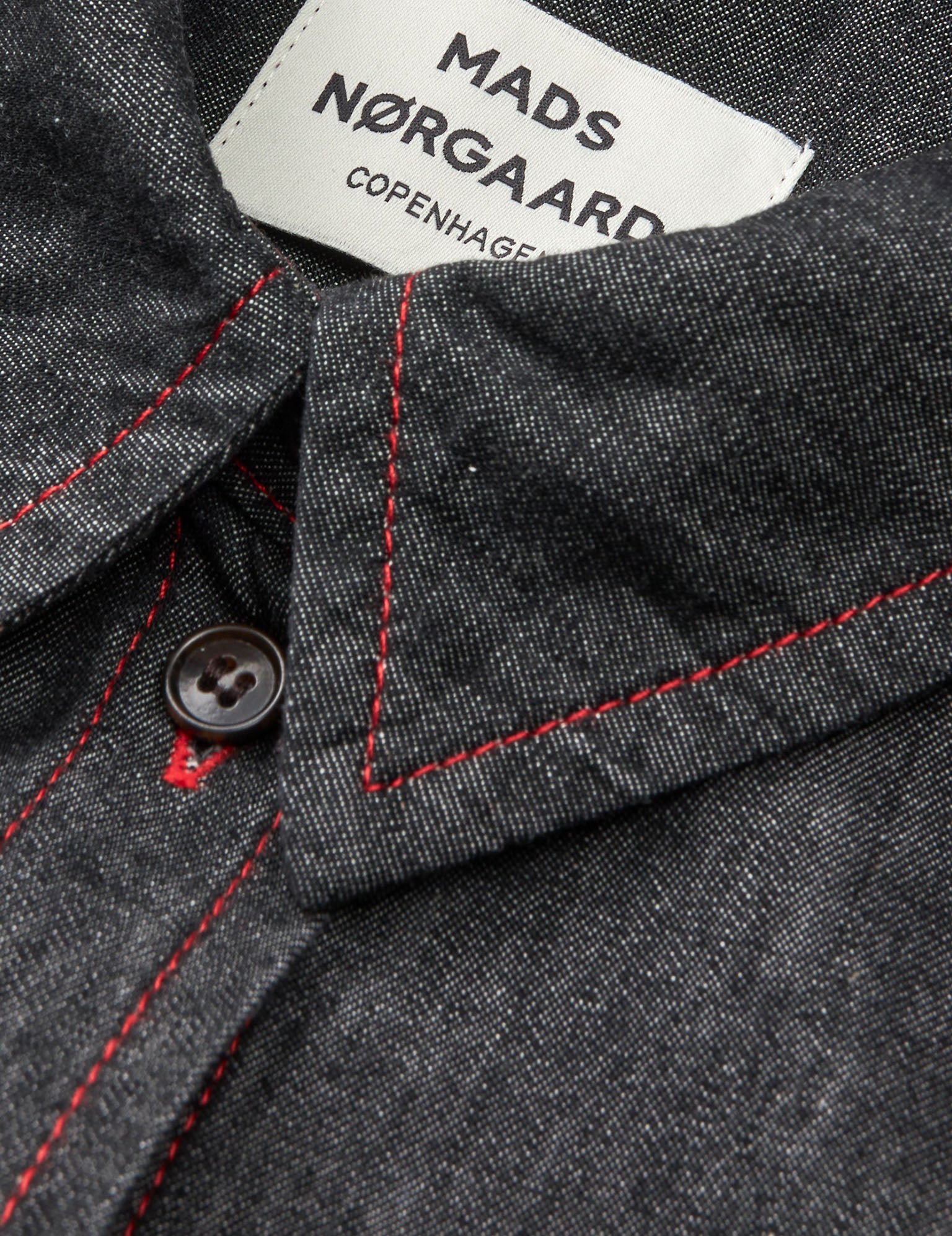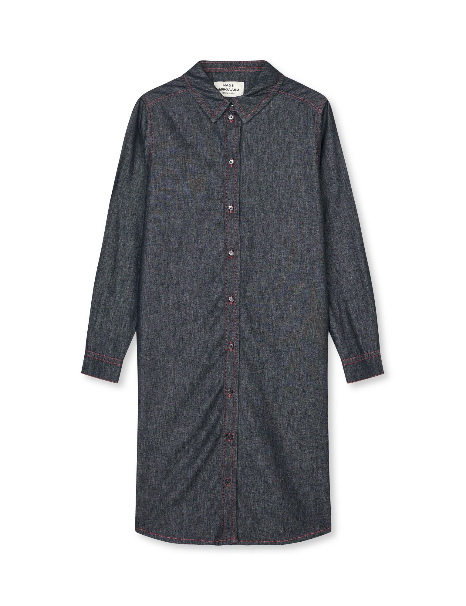 Knælang skjortekjole i let denim med let rynket front, turn-down krave og rød kontrastsyning.