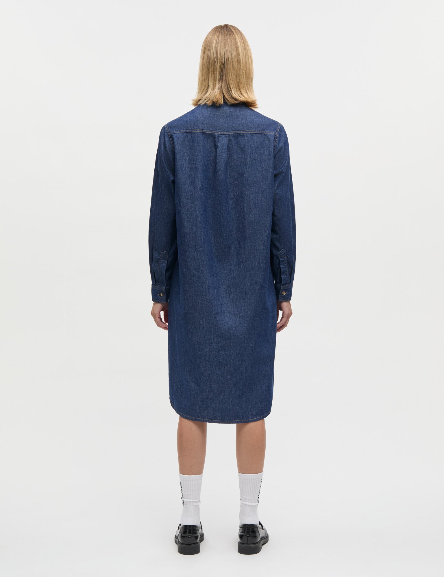 Knælang kjole i let og blød denim, med reguler skjortekrave, lange ærmer med manchet og knapper hele vejen ned.