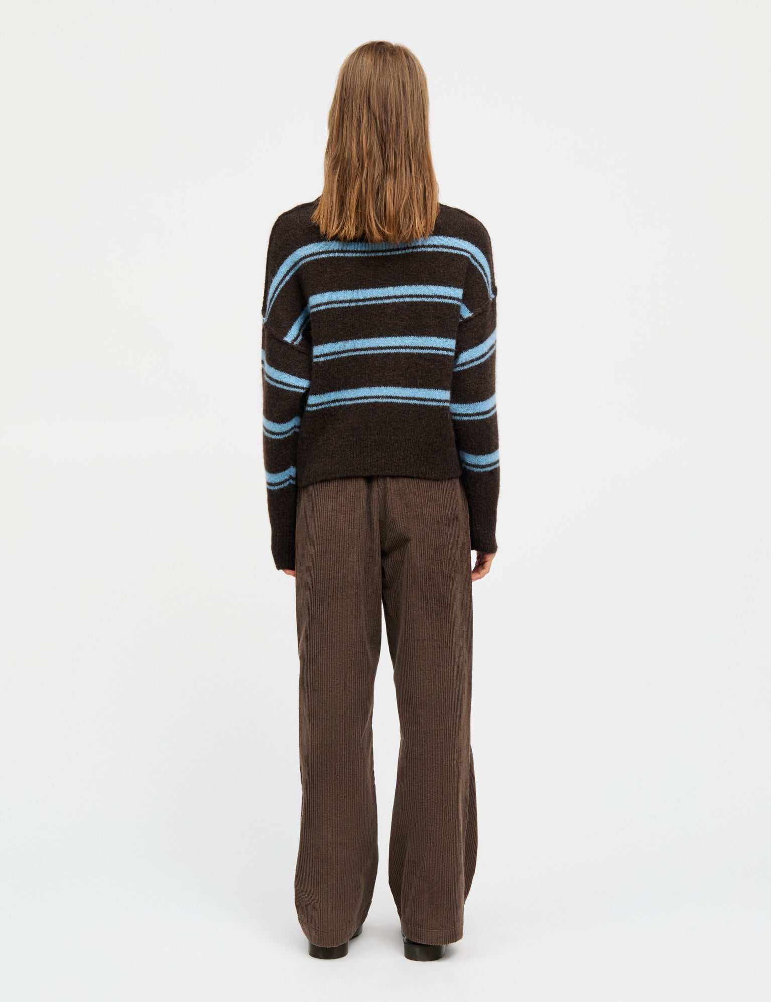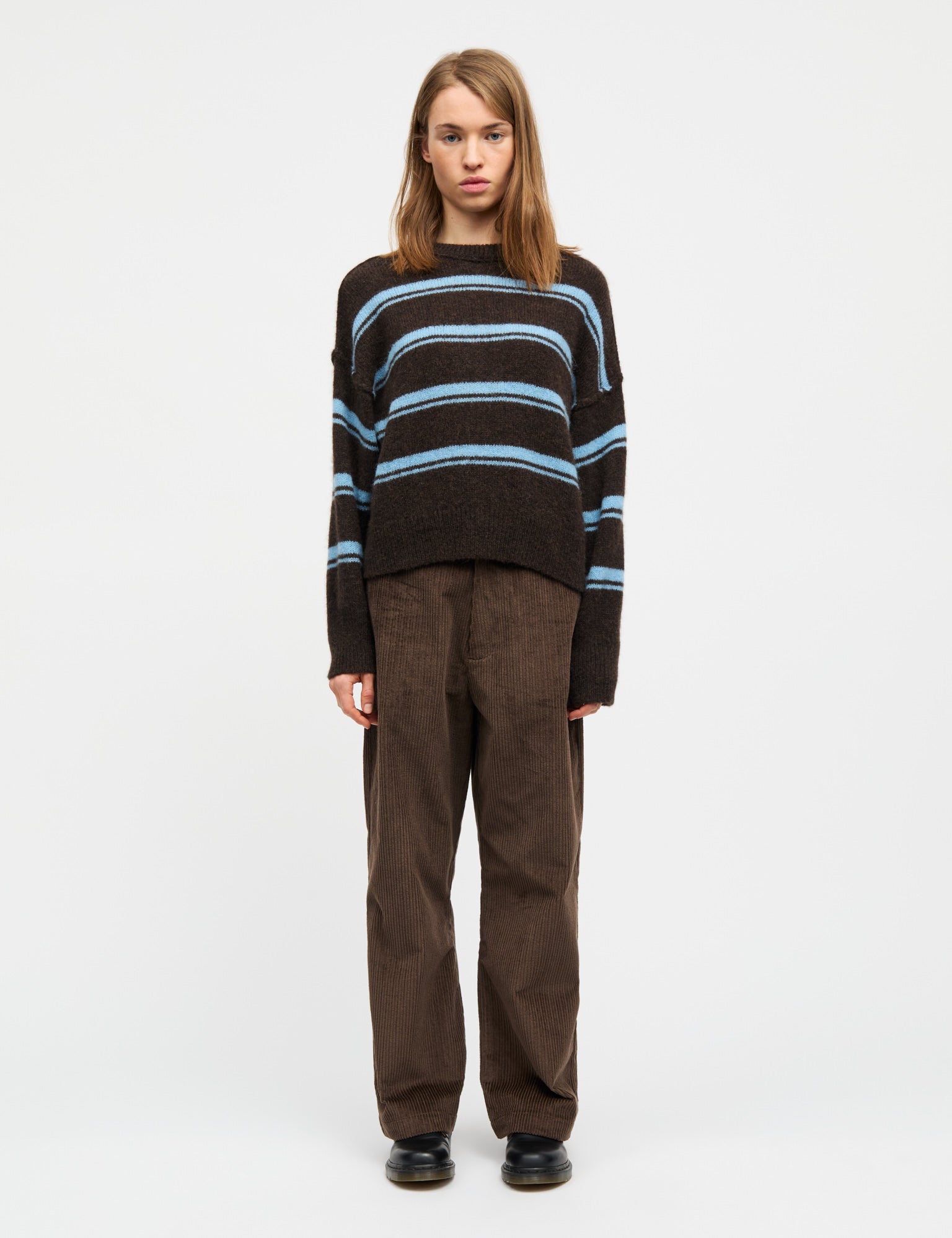 Løs, blød striktrøje med hængende skuldre og rib ved hals og bred rib ved håndled.
