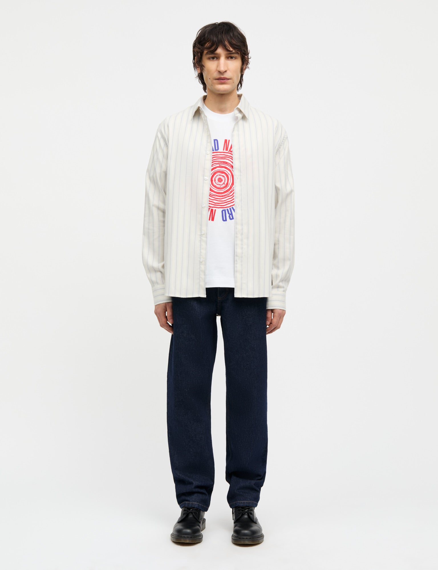 Løstsiddende 5 pocket-jeans med lige ben, læderlabel bagpå, lynlås og knap.