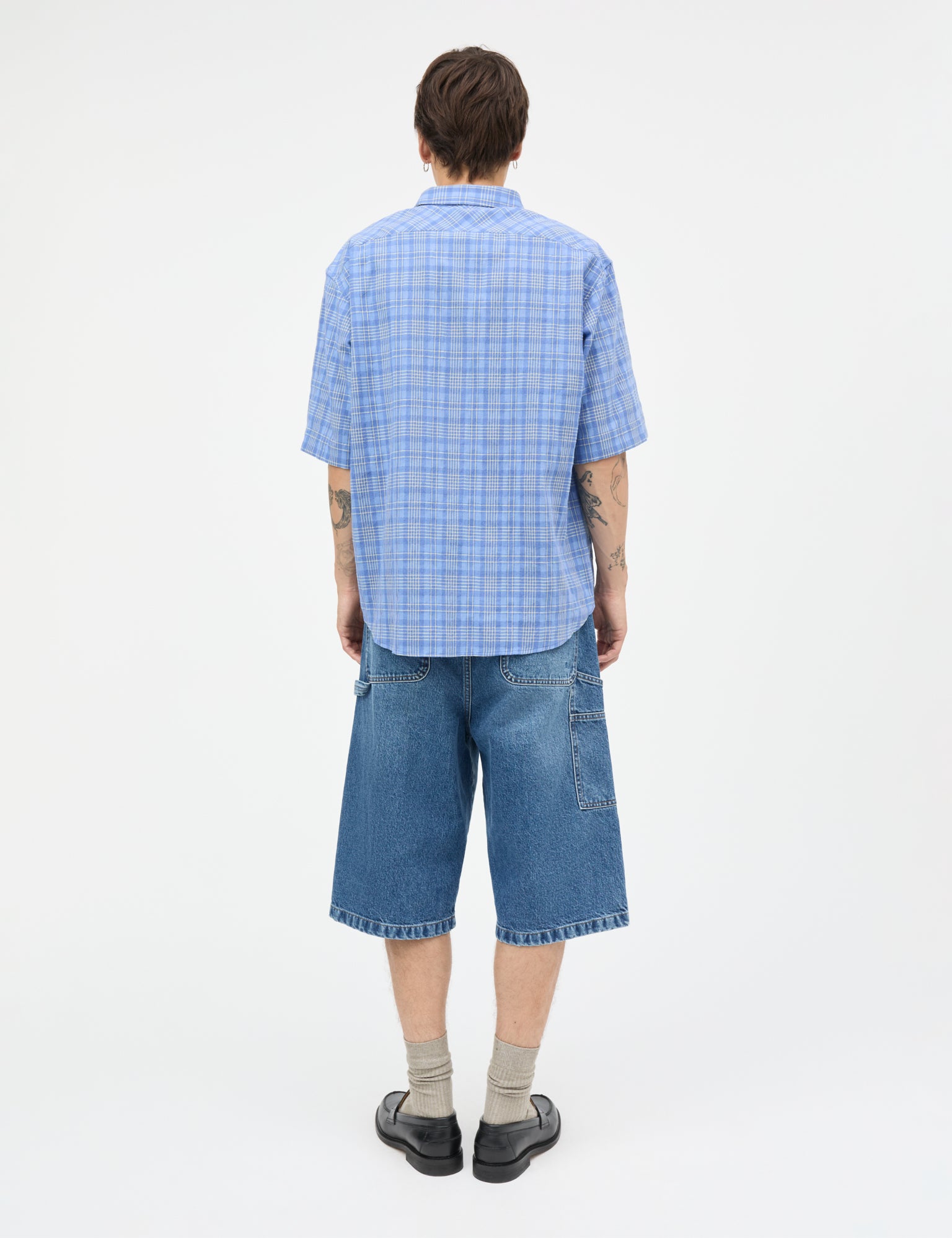 Knælange denimshorts med skrålommer foran og store påsyede baglommer. Let baggy fit og klassisk lukning med knap og lynlås.
