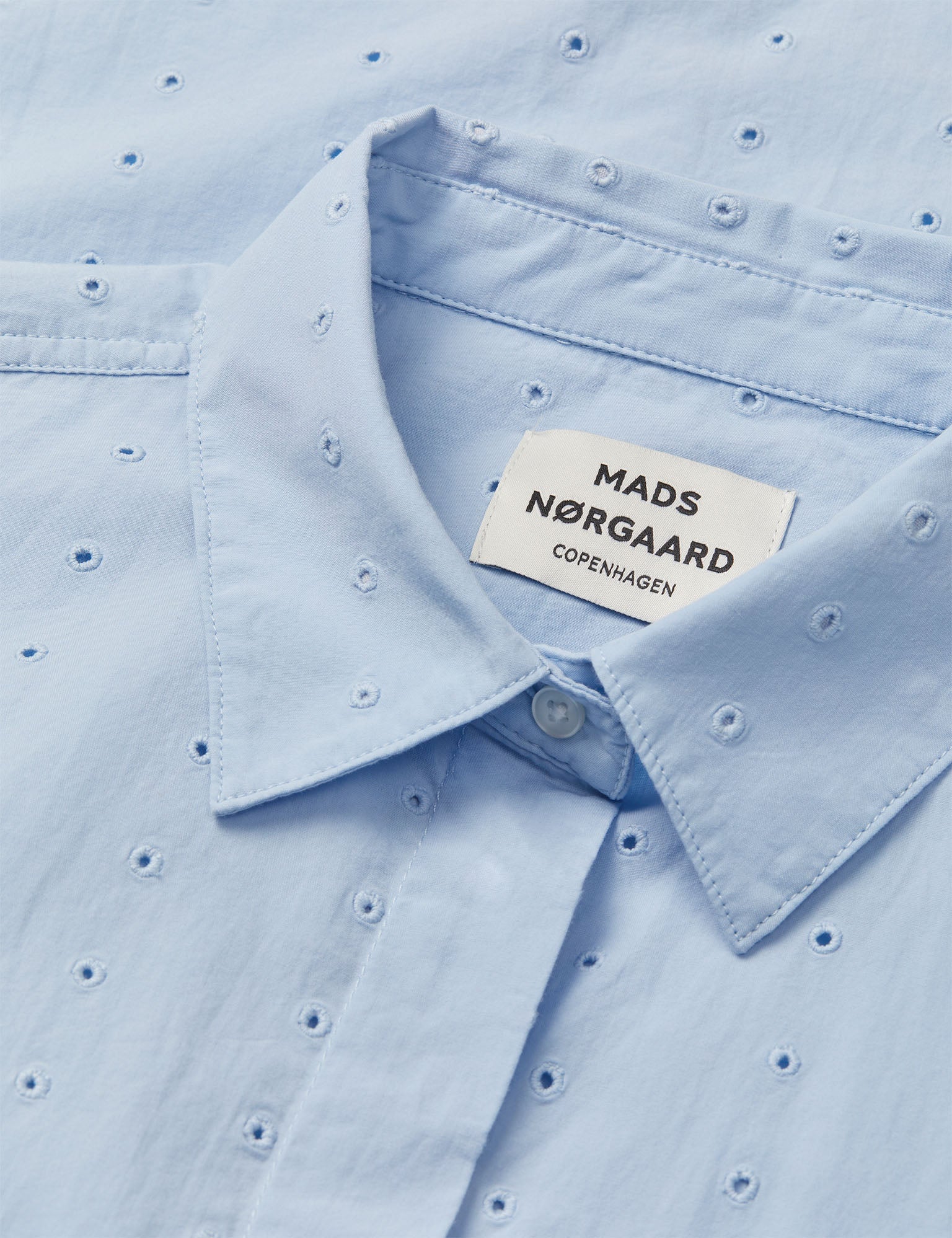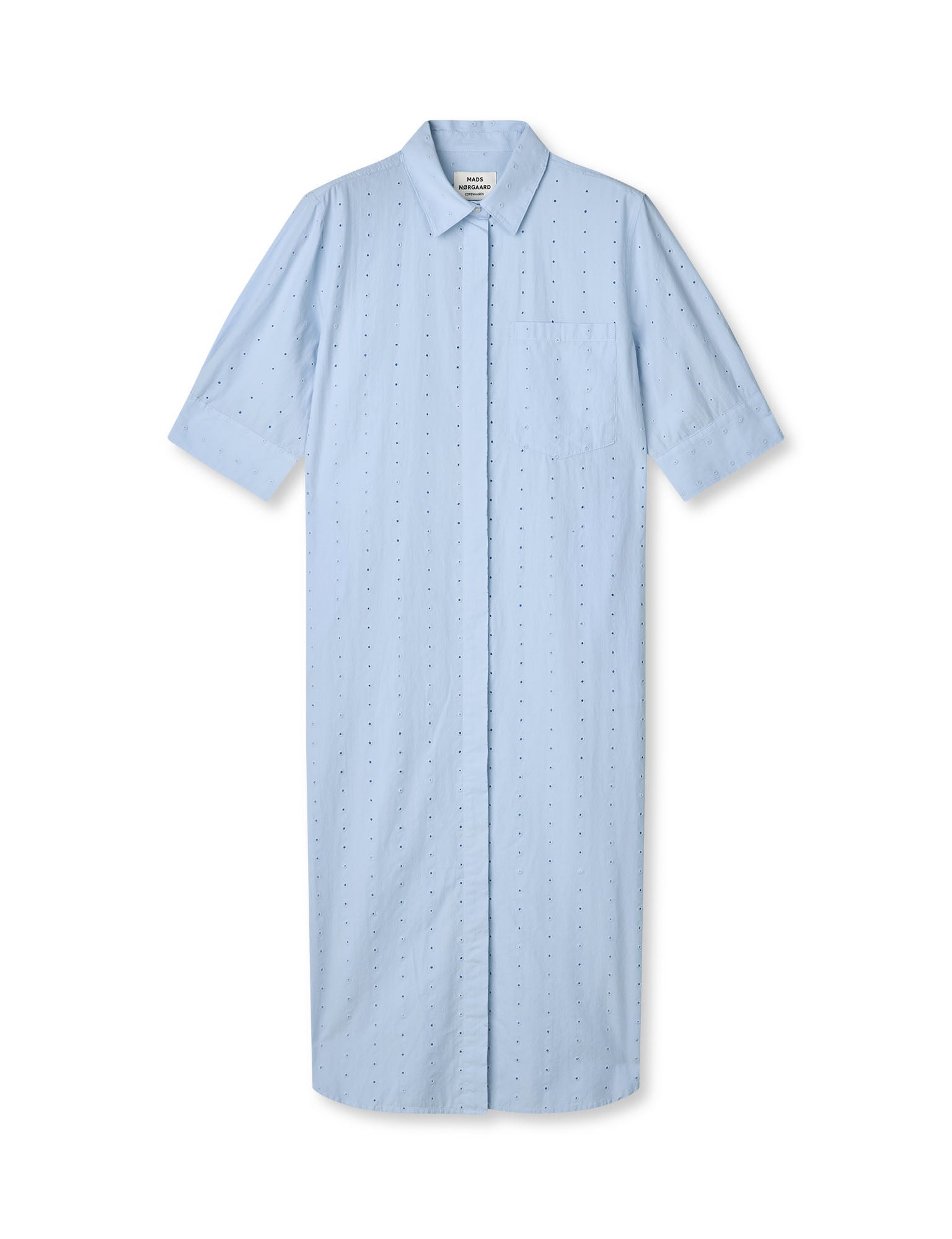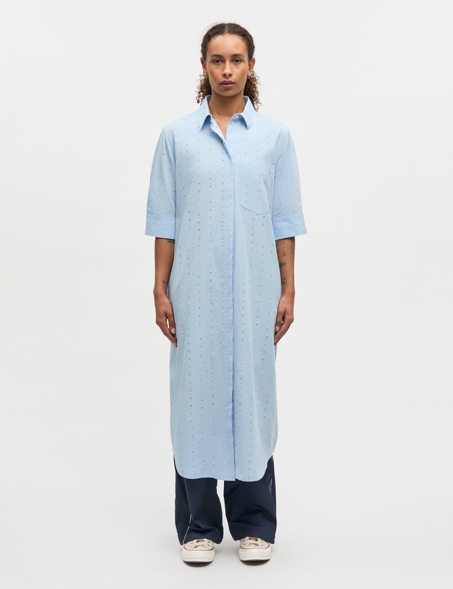 Løs skjortekjole med hulmønster i let crispy bomuld med korte ærme, hulmønster, brystlomme og knaplukning foran.