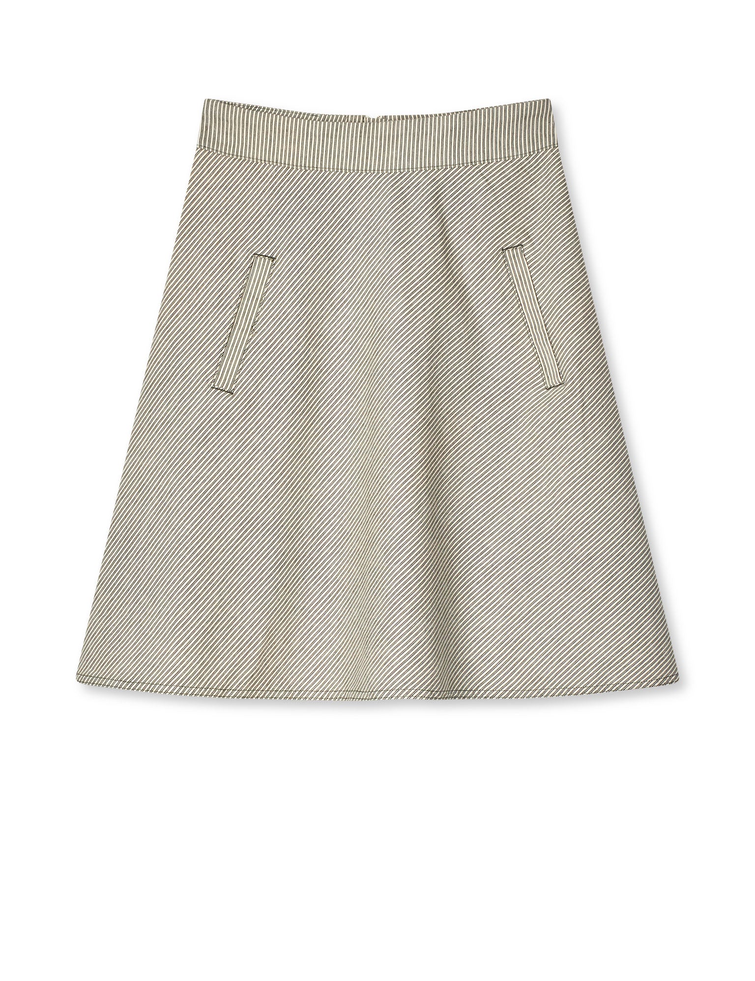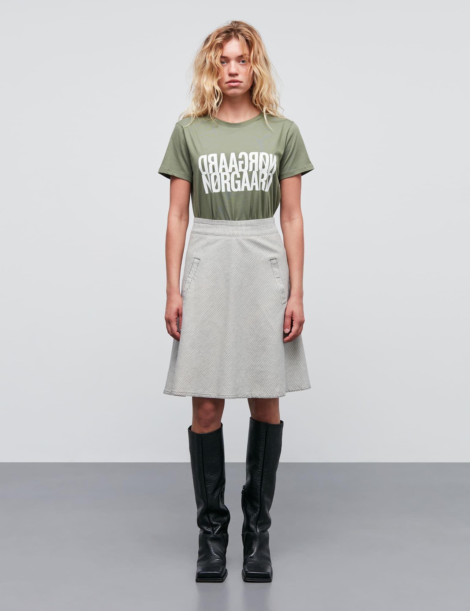 A-formet, knælang og stretchy nederdel med høj talje og fast linning med lynlås og lommer.