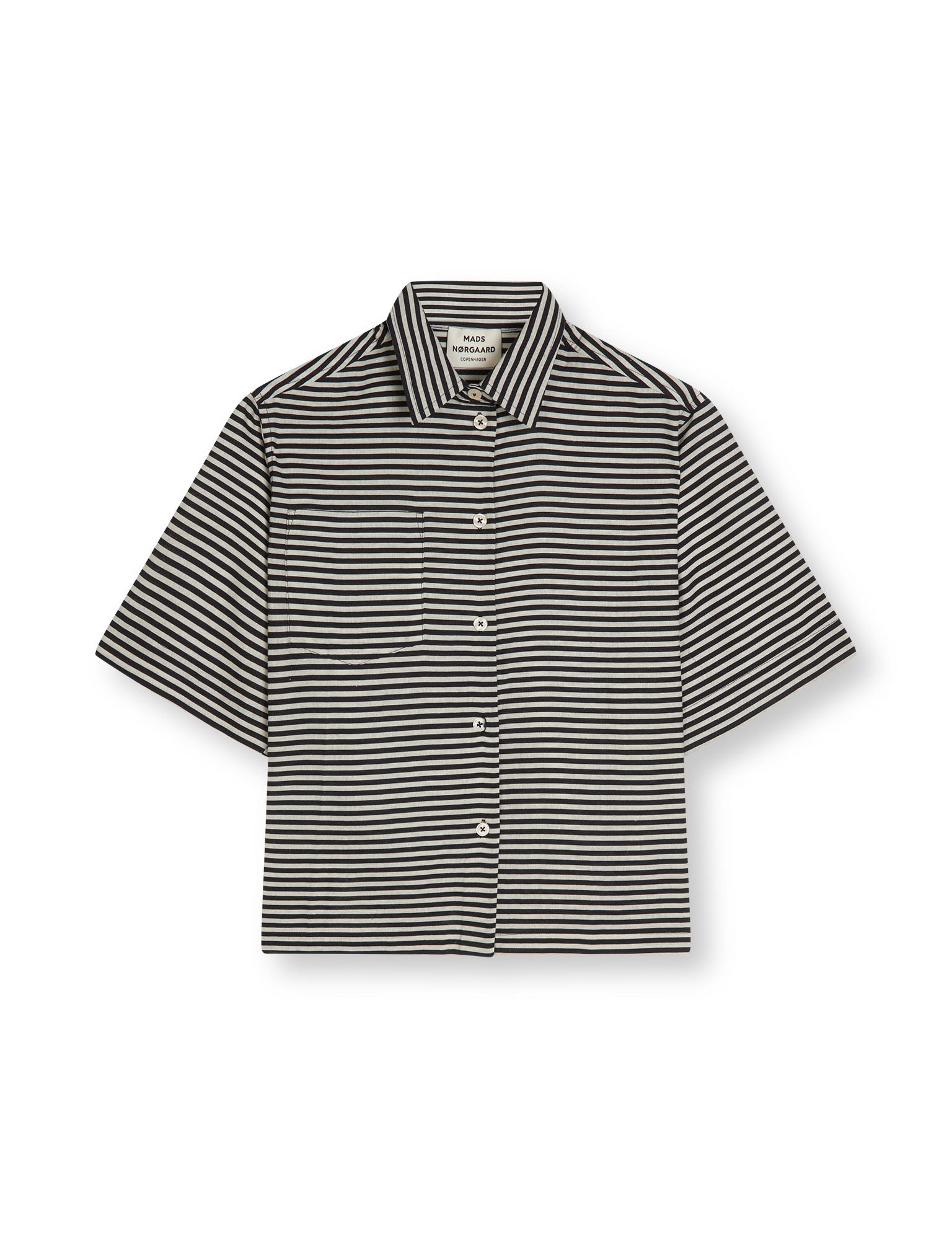 Vores Colin Lorella Shirt AOP er en bred og boxy skjorte i let og tør linned. Skuldrene falder en smule, de korte ærmer har lidt længde, kraven er turn-down, knapperne er små, og på det ene bryst sidder en åben udvendig lomme.