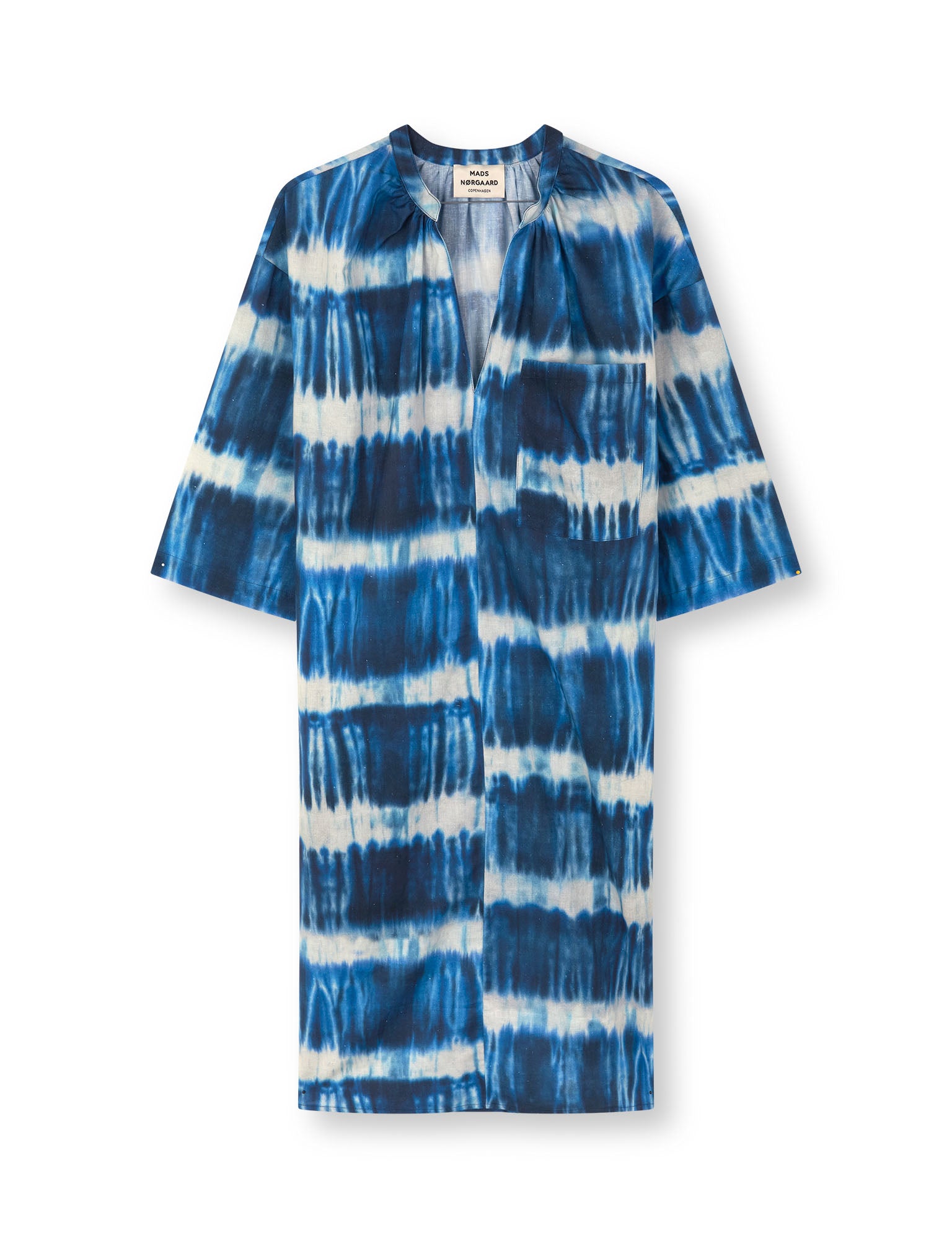 Vores Colin Mana Dress AOP er en bred og boxy kjole i let og tør linned. Skuldrene falder, ærmerne er lange, udskæringen er en dyb V-udskæring, længden er knælang, kraven er en kinakrave og på det ene bryst sidder en åben udvendig lomme.