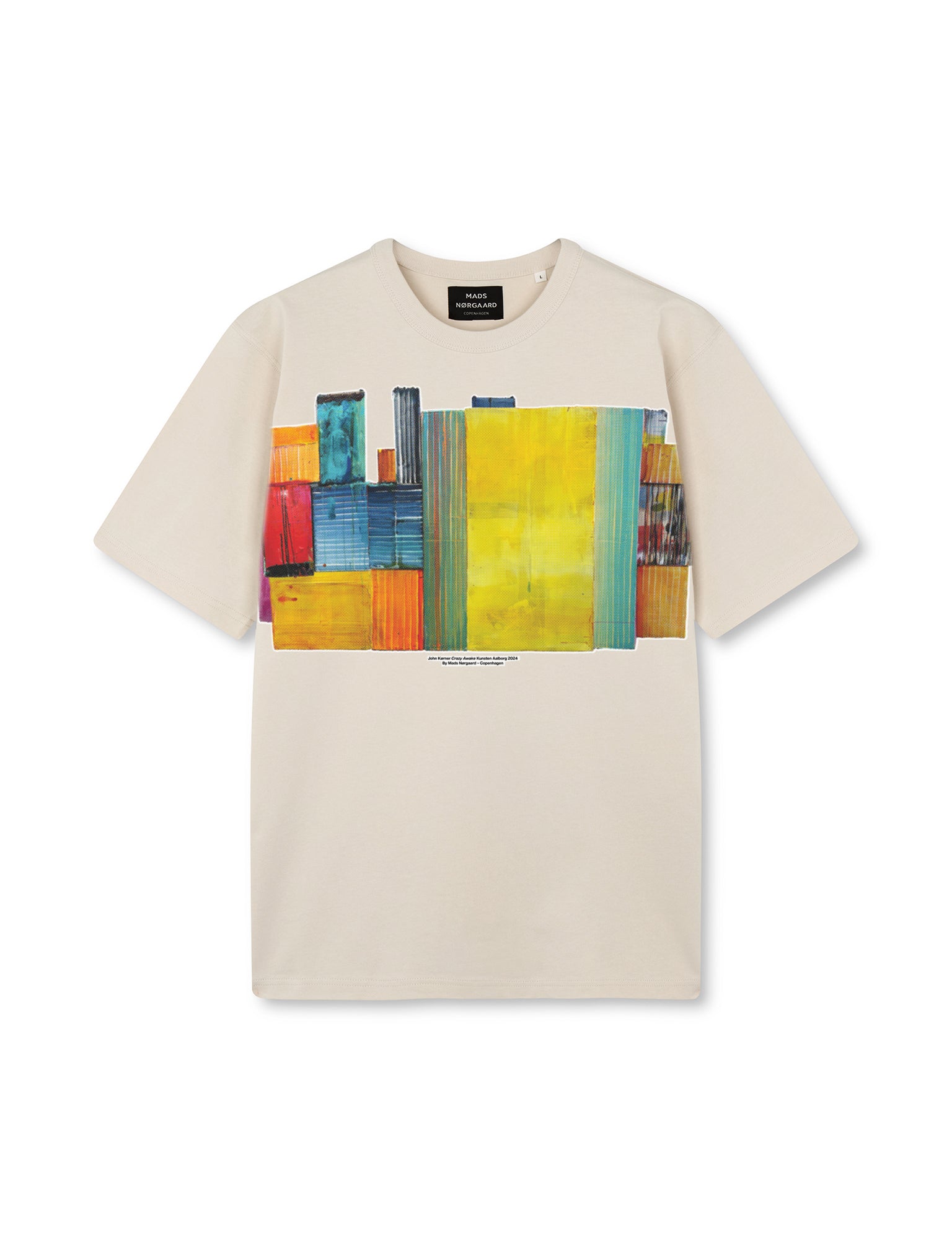I forbindelse med John Kørners nye udstilling ”Crazy Awake” på Kunsten Museum of Modern Art har Mads Nørgaard – Copenhagen skabt en mini kollektion med et affotograferet print fra ét af John Kørners værker. Denne style er lavet i en blød og tung bomuld. Pasformen er oversize med drop shoulders og med print på brystet. Alle frontprints på mini-kollektionen er printet i hånden hos Ice Screen Printing og kan derfor variere i udtryk.