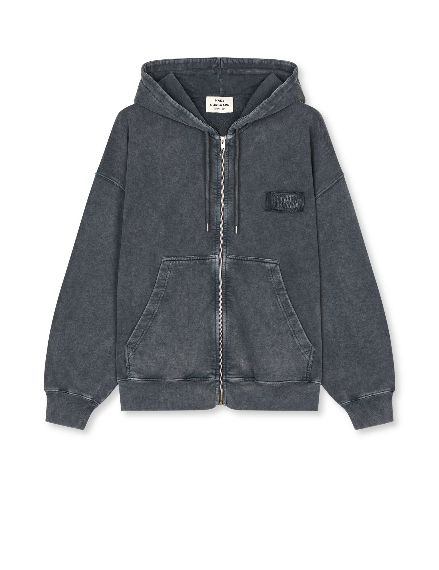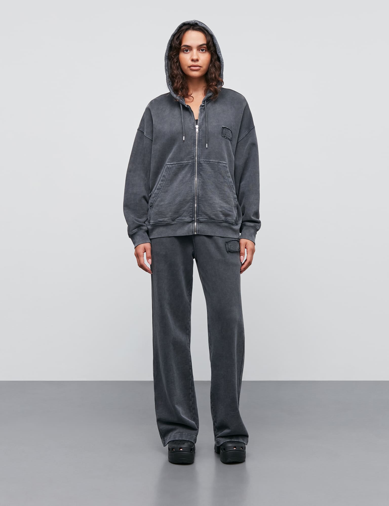 Oversized hoodie med lynlås, delt kængurulomme på maven, lave skuldre og lille logo broderet på brystet.