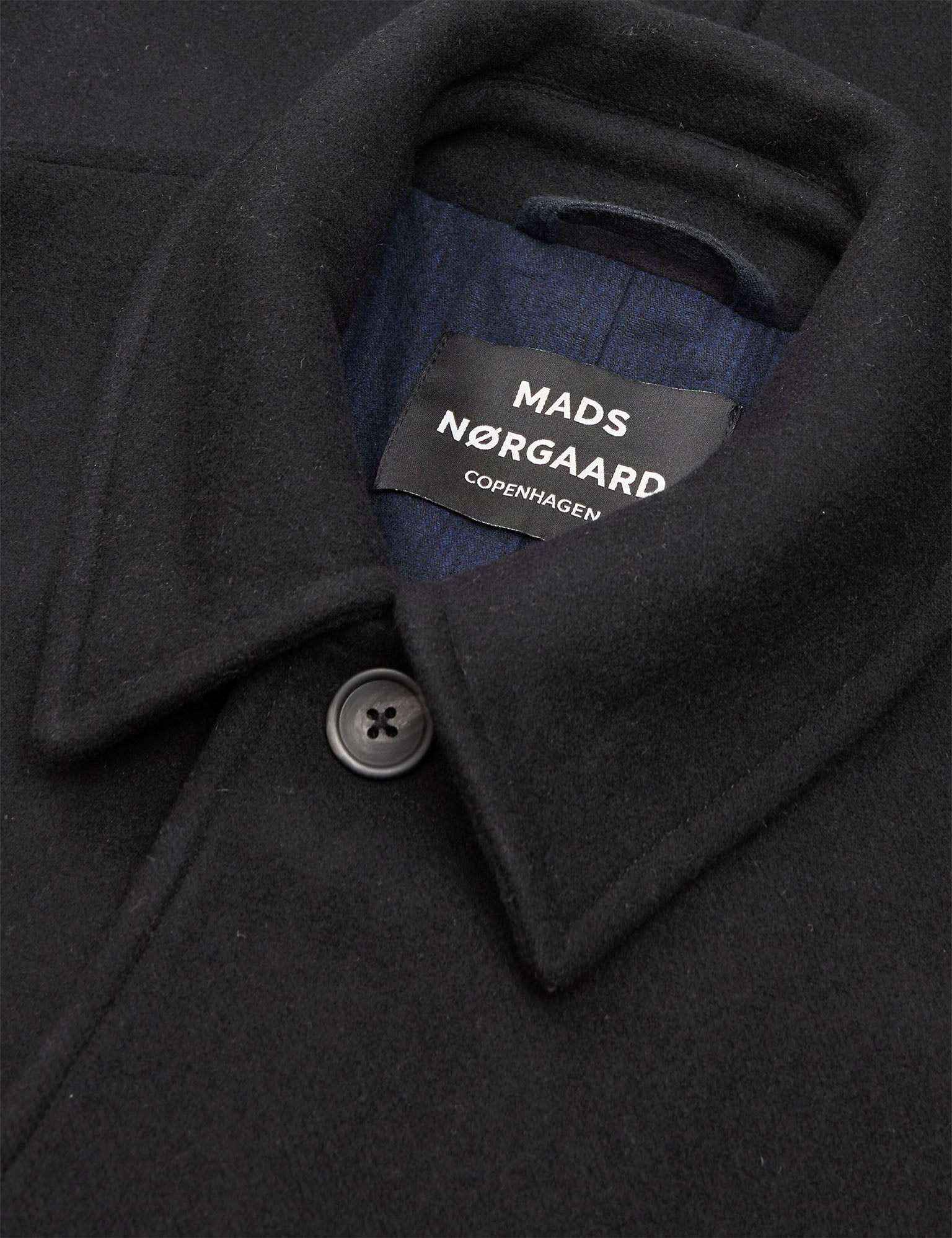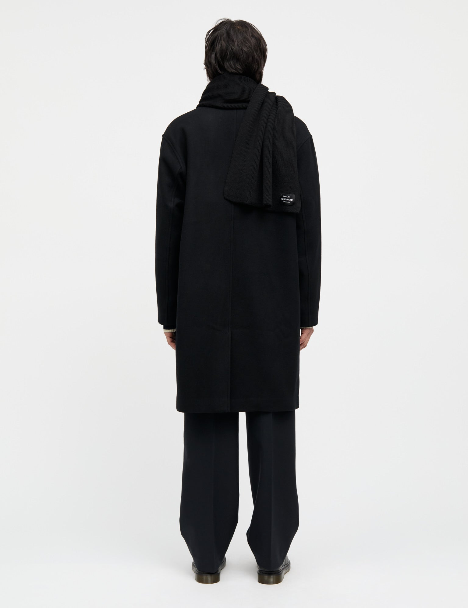 Lang og løs ulden frakke med afrundet turn-down krave, medium knapper og stiklommer.