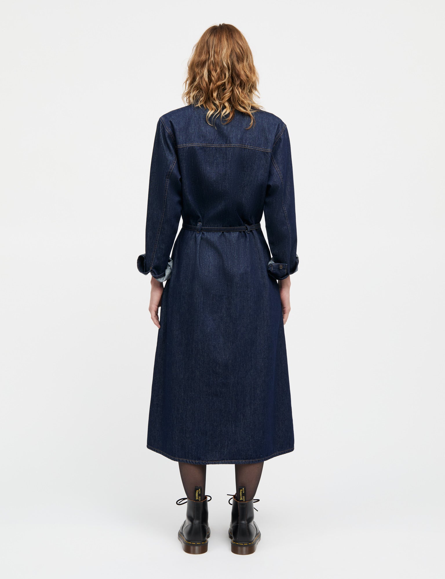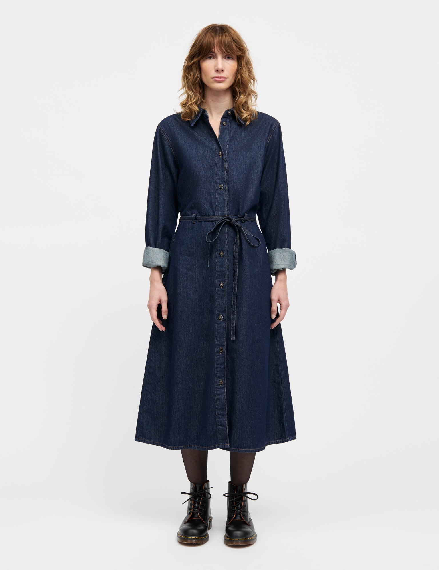 Læglang skjortekjole i blød og let denim med A-facon, turn-down krave og bindebælte i taljen.