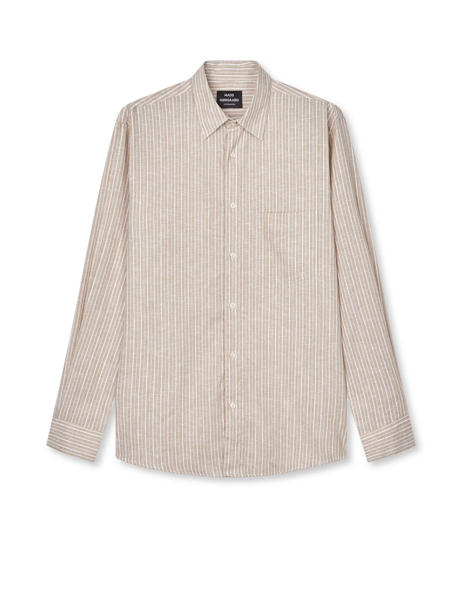 Cotton Linen Sune Stripe er en glat og smidig skjorte af hør og bomuld. Pasformen er regular, forholdsvis lige op og ned og med små knapper, tynde striber og en button-down krave.