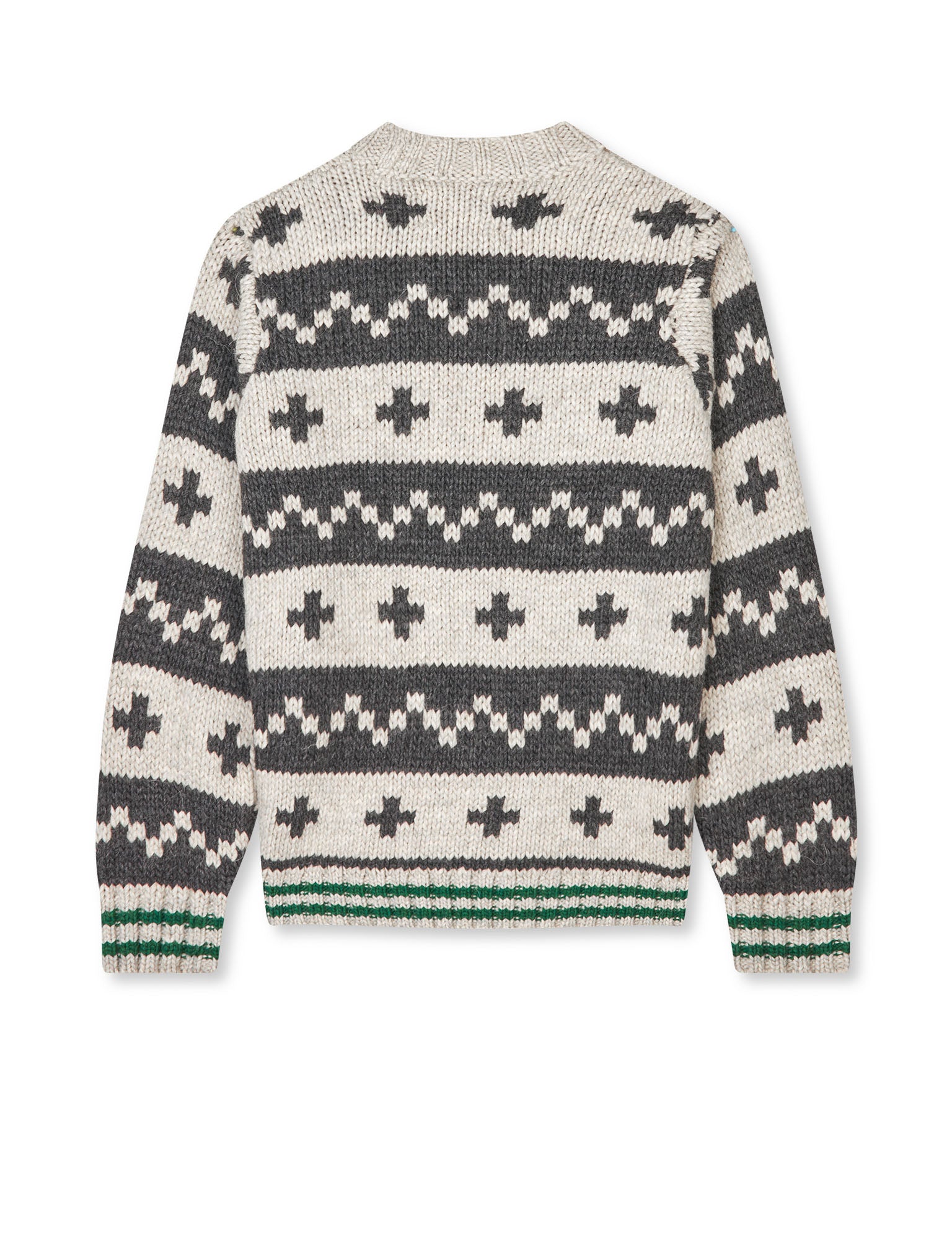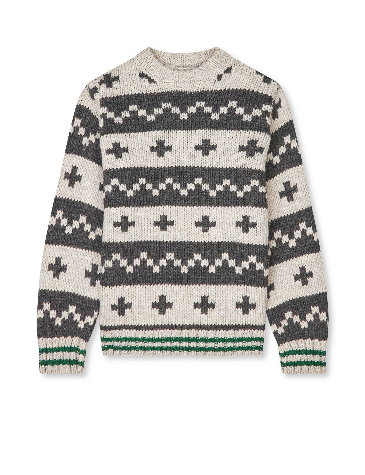 Blød og kraftig striktrøje med et nordisk mønster, grøn kontraststrib og ribkanter.