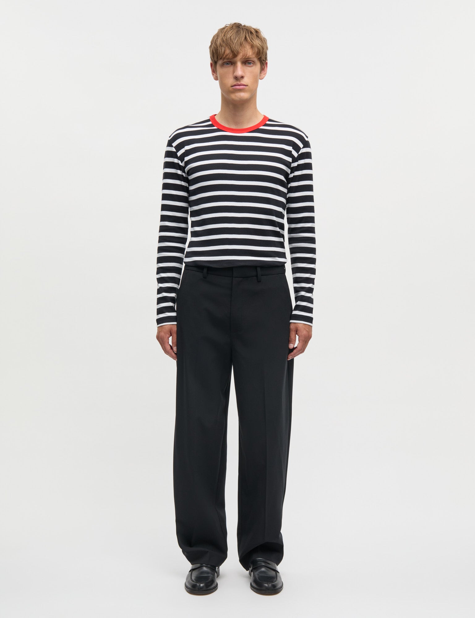 Modellen er 187 cm. høj og iført en størrelse 50/Large og 32 ved jeans.