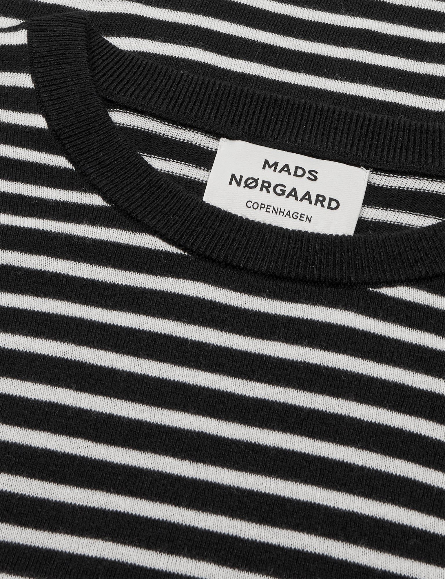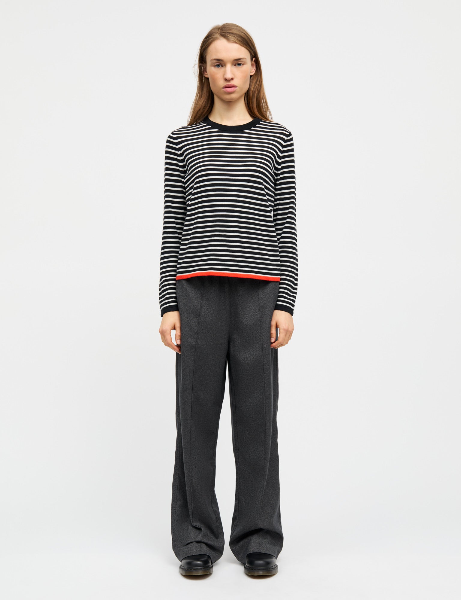 Helt glat og finmasket striktrøje med rund hals, kontrastkant og ingen rib.