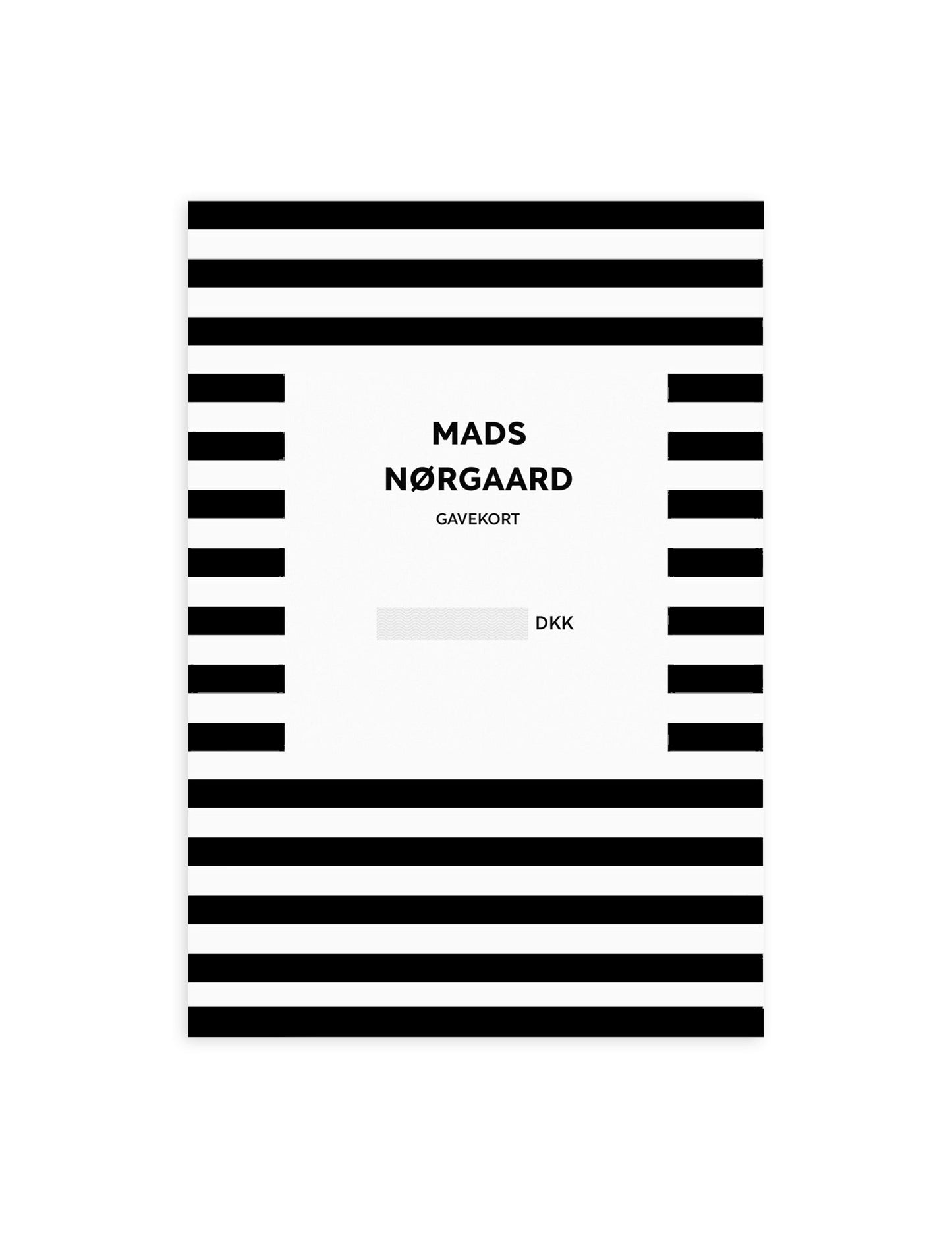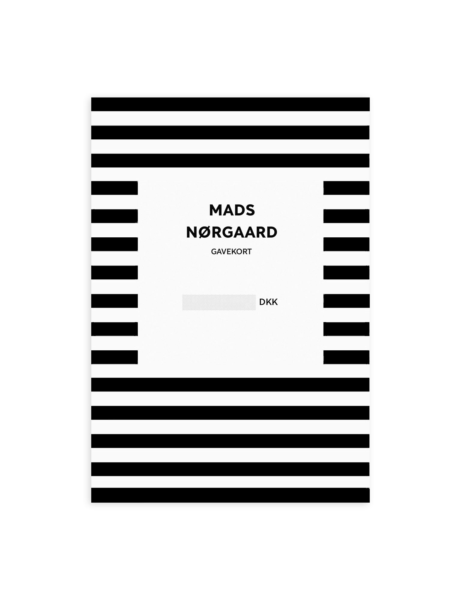 Med et et gavekort til Mads Nørgaard - Copenhagen kan du lade modtageren selv vælge hvad pengene skal bruges på. Gavekortet sendes per email umiddelbart efter ordren er afgivet. Det kan indløses i forbindelse med et hvilket som helst køb her på webshoppen og har ingen udløbsdato. Vær opmærksom på at gavekortet ikke kan anvendes i vores fysiske butikker.