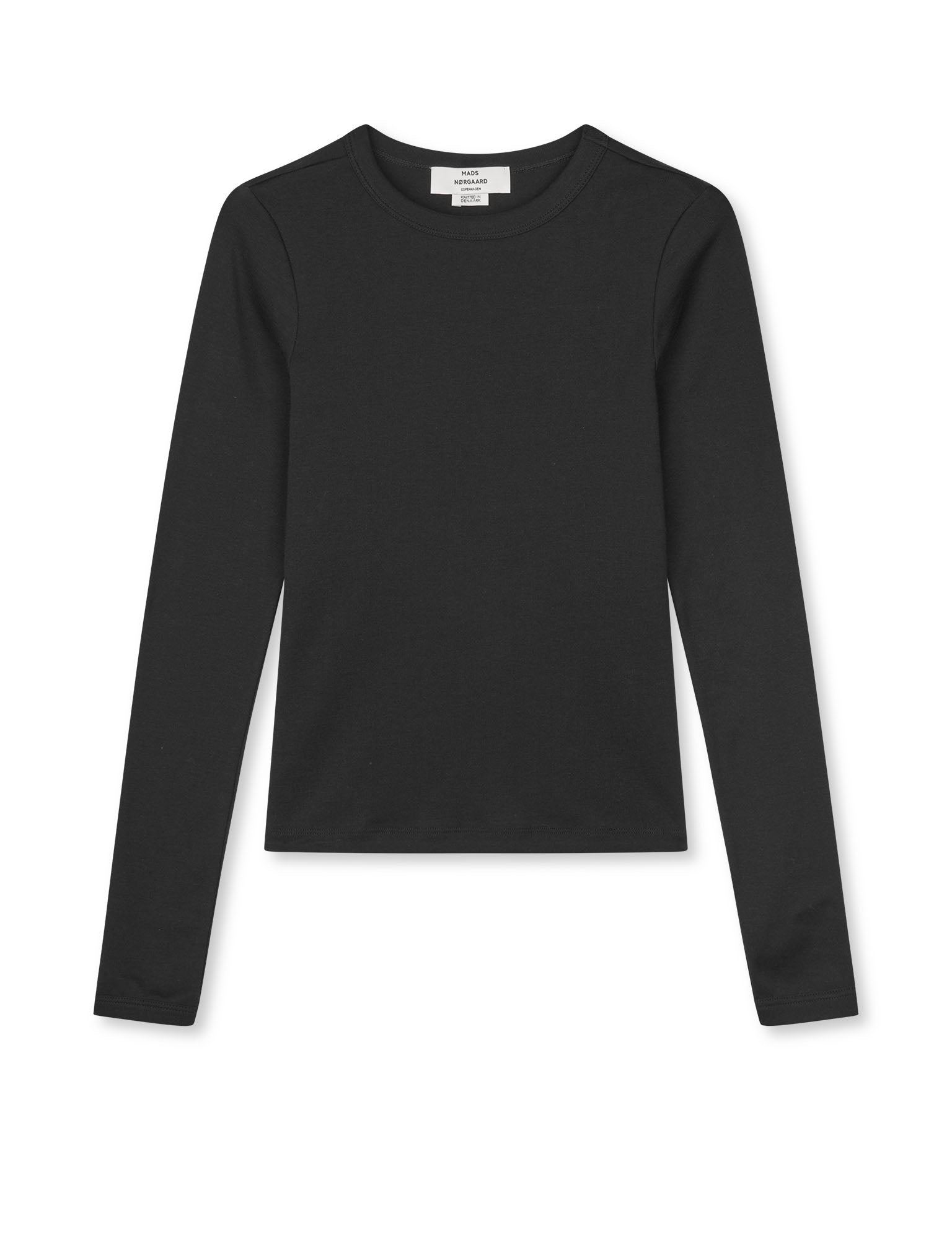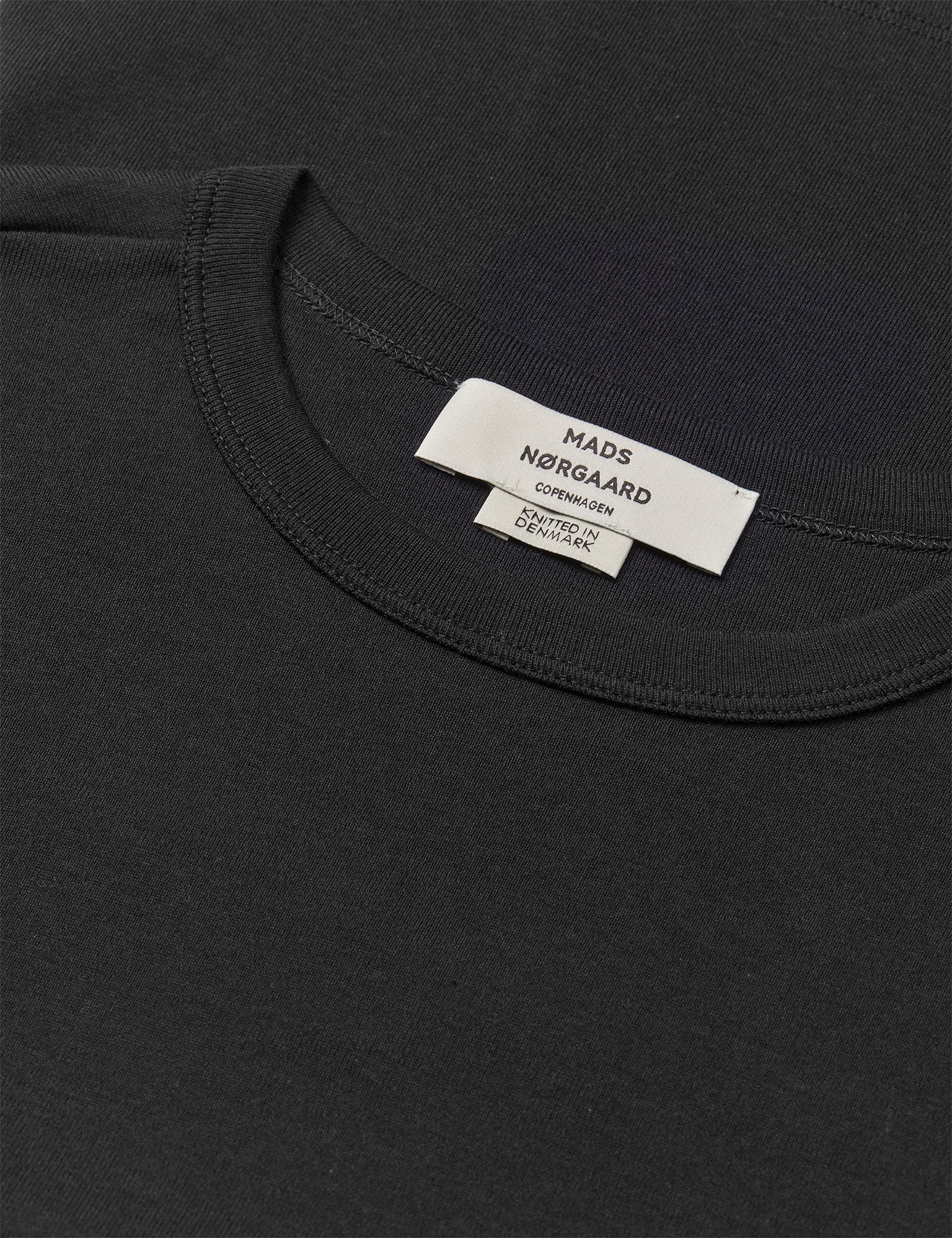 Tætsiddende bluse med rund hals, lange ærmer og jævn, elastisk fit. Denne t-shirt er designet til at sidde og føles helt rigtigt. Den er skabt af langfibret bomuld for et blødt, behageligt feel og en pasform, der holder vask efter vask. Stoffet er strikket hos en familieejet strikproducent i Isenvad, Danmark, som har været Mads Nørgaards faste samarbejdspartner i årtier. Her bliver den lokale strikketradition med stolthed holdt i live, og hvert eneste trin i produktionen bliver nøje fulgt.