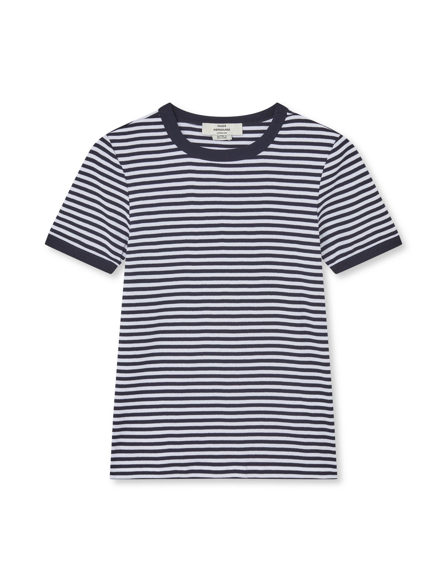 Enkel og tætsiddende t-shirt med rund hals, korte ærmer og glat overflade. Denne t-shirt er designet til at sidde og føles helt rigtigt. Den er skabt af langfibret bomuld for et blødt, behageligt feel og en pasform, der holder vask efter vask. Stoffet er strikket hos en familieejet strikproducent i Isenvad, Danmark, som har været Mads Nørgaards faste samarbejdspartner i årtier. Her bliver den lokale strikketradition med stolthed holdt i live, og hvert eneste trin i produktionen bliver nøje fulgt. T-shirten har et klassisk snit med et moderne twist i detalje, farve eller stribe.