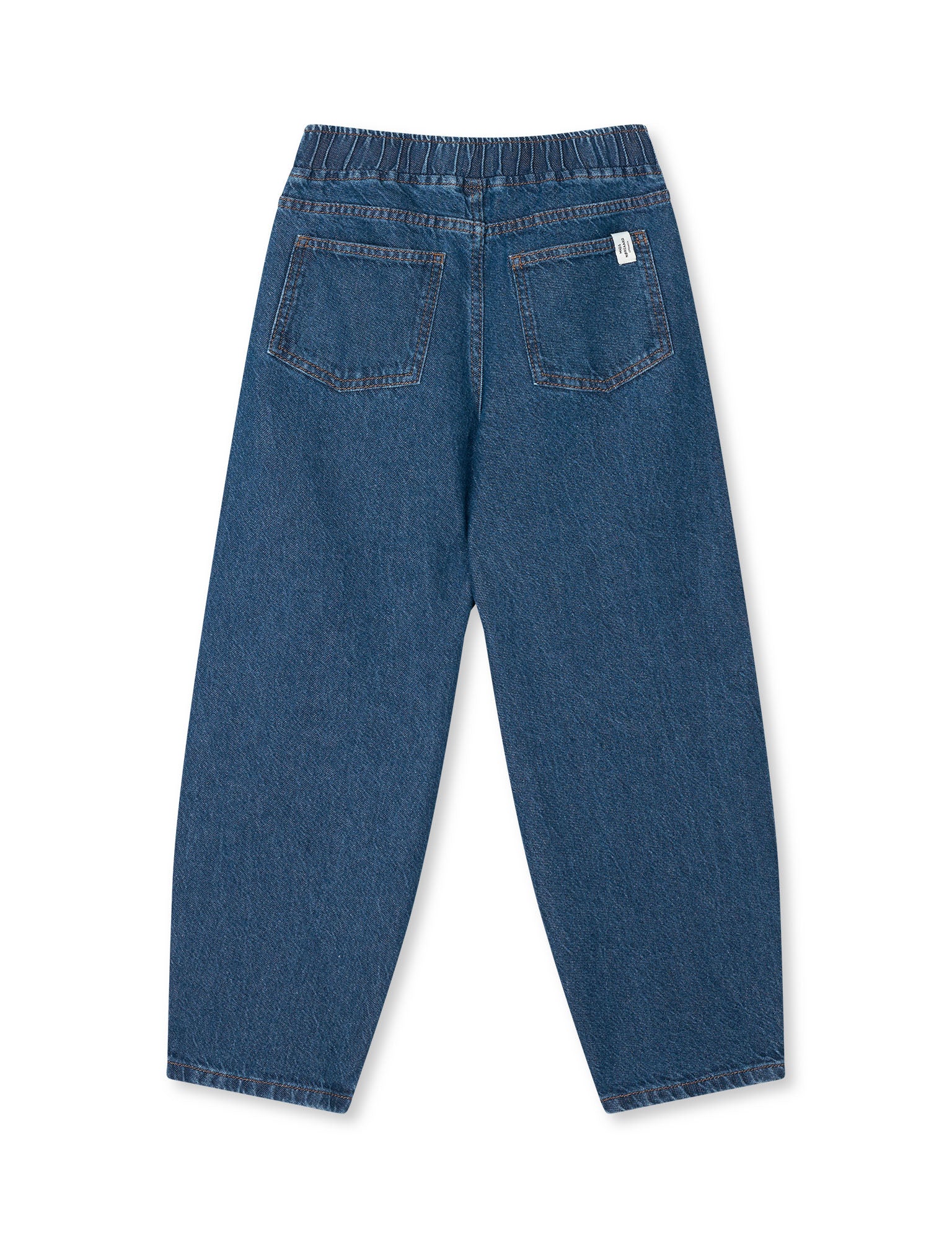 Jeans med voluminøse barrel-ben, elastisk linning og forlommer og baglommer.