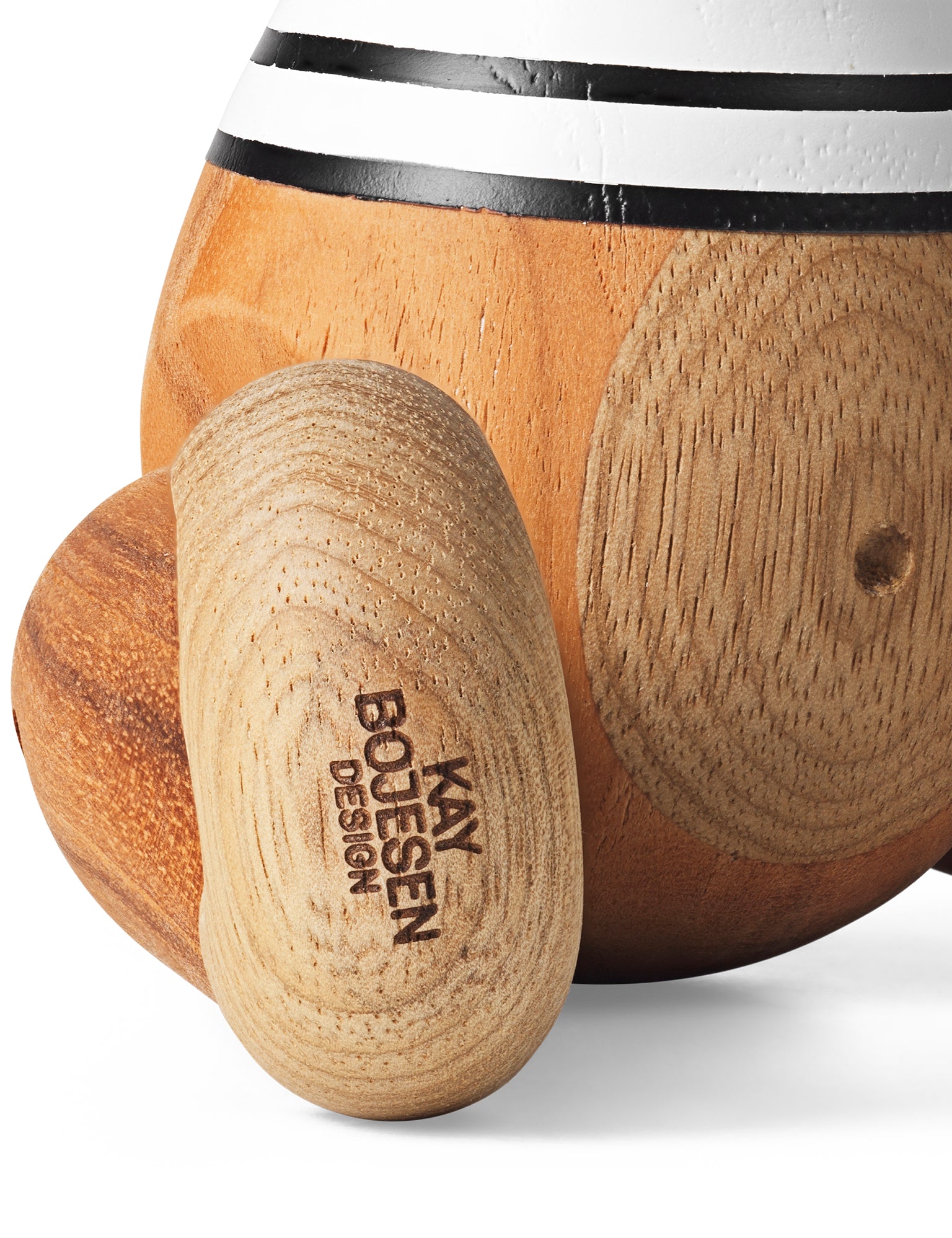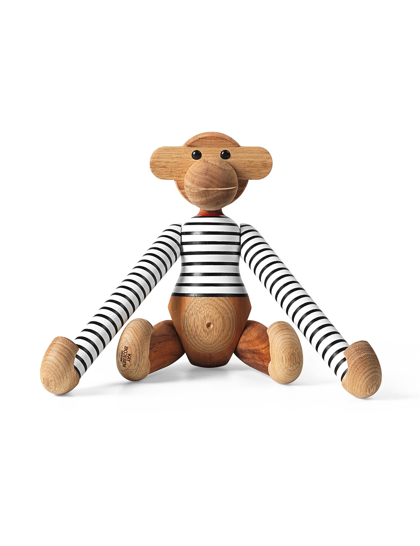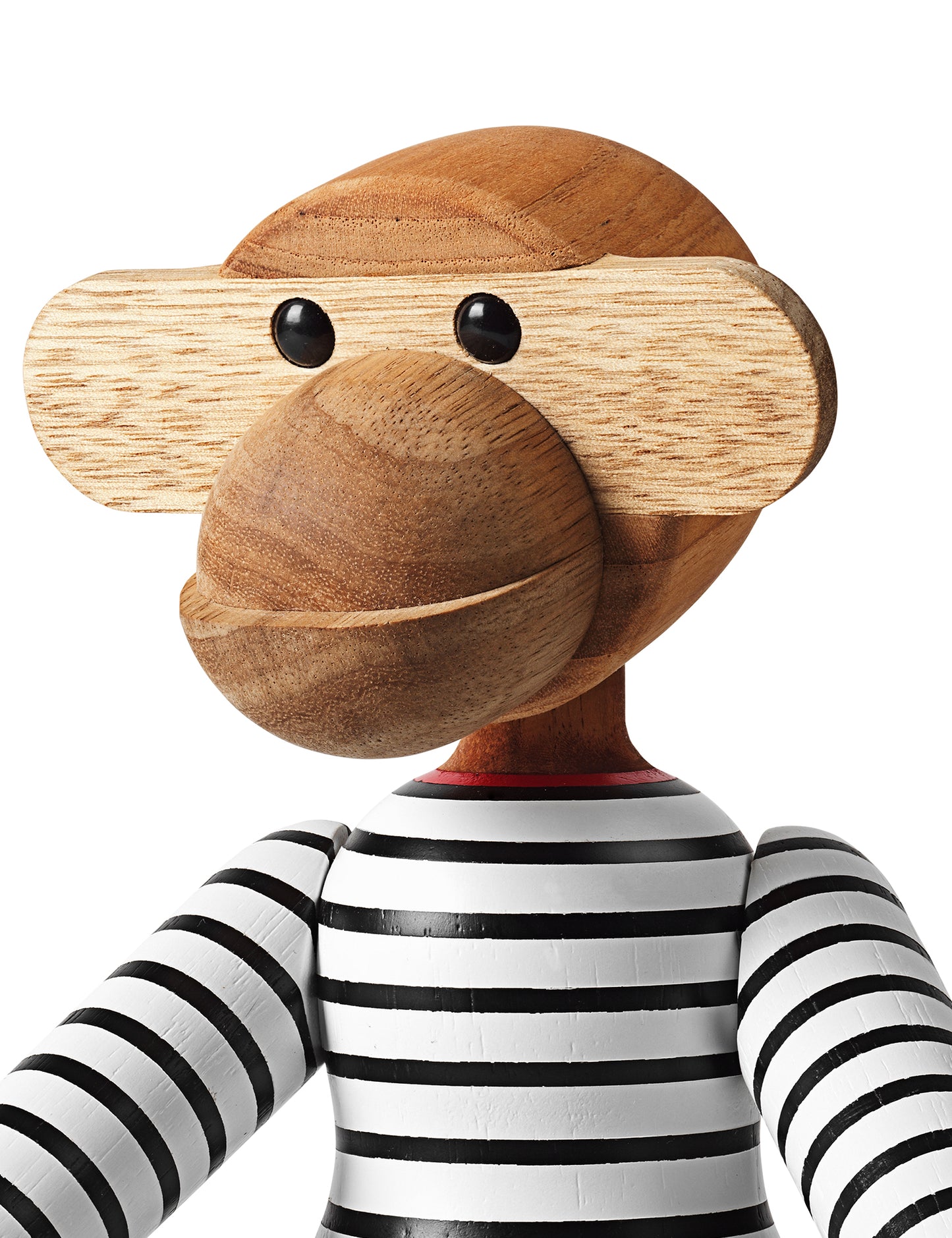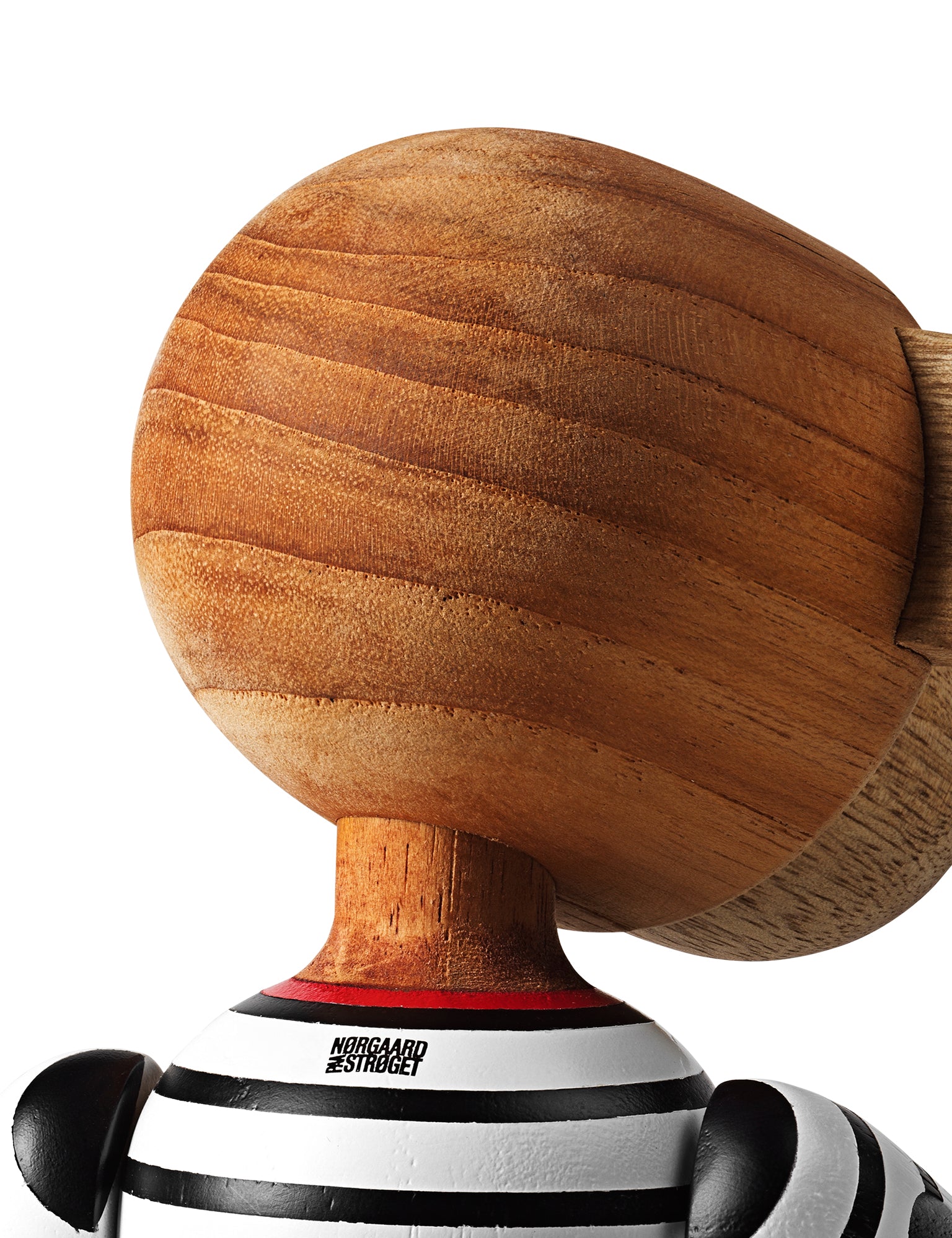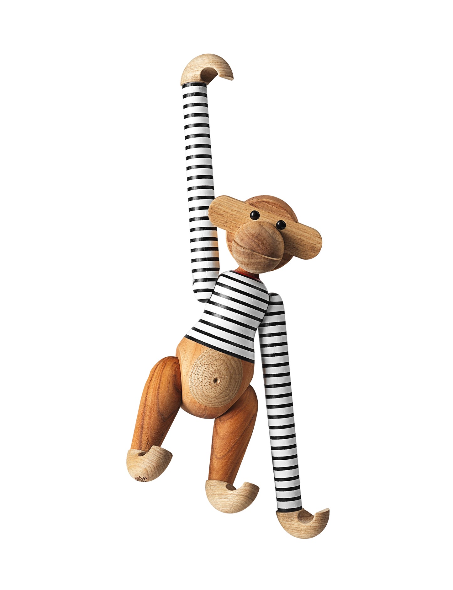 To af de mest ikoniske pejlemærker i dansk designhistorie er gået sammen for at hylde de smilende linjer og glade striber. To af de mest ikoniske pejlemærker i dansk designhistorie er gået sammen for at hylde de smilende linjer og glade striber, de hver især har bidraget med til dansk design. Den berømte Kay Bojesen Abe blev skabt tilbage i 1951, da Kay Bojesen ville lave en knage i børnehøjde, så hans børn kunne nå tøjet, men i stedet endte han med at lave et verdenskendt dansk designikon. Nu har den ikoniske Abe selv fået tøj på. Og hvad klæder bedre et dansk designikon end et andet dansk designikon? Den mellem Kay Bojesen Abe x Nørgaard paa Strøget er fremstillet i FSC®-certificeret teak og limba og måler 28 cm i højden. Du kan få Aben med den flotte påmalede Nørgaard paa Strøget #101 T-shirt i enten sort med hvide striber eller hvid med sorte striber. Begge farvevarianter er med den velkendte røde halskant, du kun finder på #101 T-shirts i den eksklusive Nørgaard paa Strøget-version i butikken på Amagertorv i København. Kay Bojesen er synonym med original dansk formgivning og design. Og samarbejdet med Mads Nørgaard binder kærligheden til holdbare og varige produkter sammen og tilføjer samtidig netop den leg og finurlighed, som Kay Bojesen selv elskede at tilføje til sine designs for at sætte fantasien i gang og skabe originale fortællinger i træ. Den ikoniske Abe i nye klæder er en sjov og uhøjtidelig fejring af begge designikoner, hvor vi med et glimt i øjet i fællesskab hylder humoren og de smilende linjer med farver og striber, der trækker tråde langt ind i dansk designhistorie.