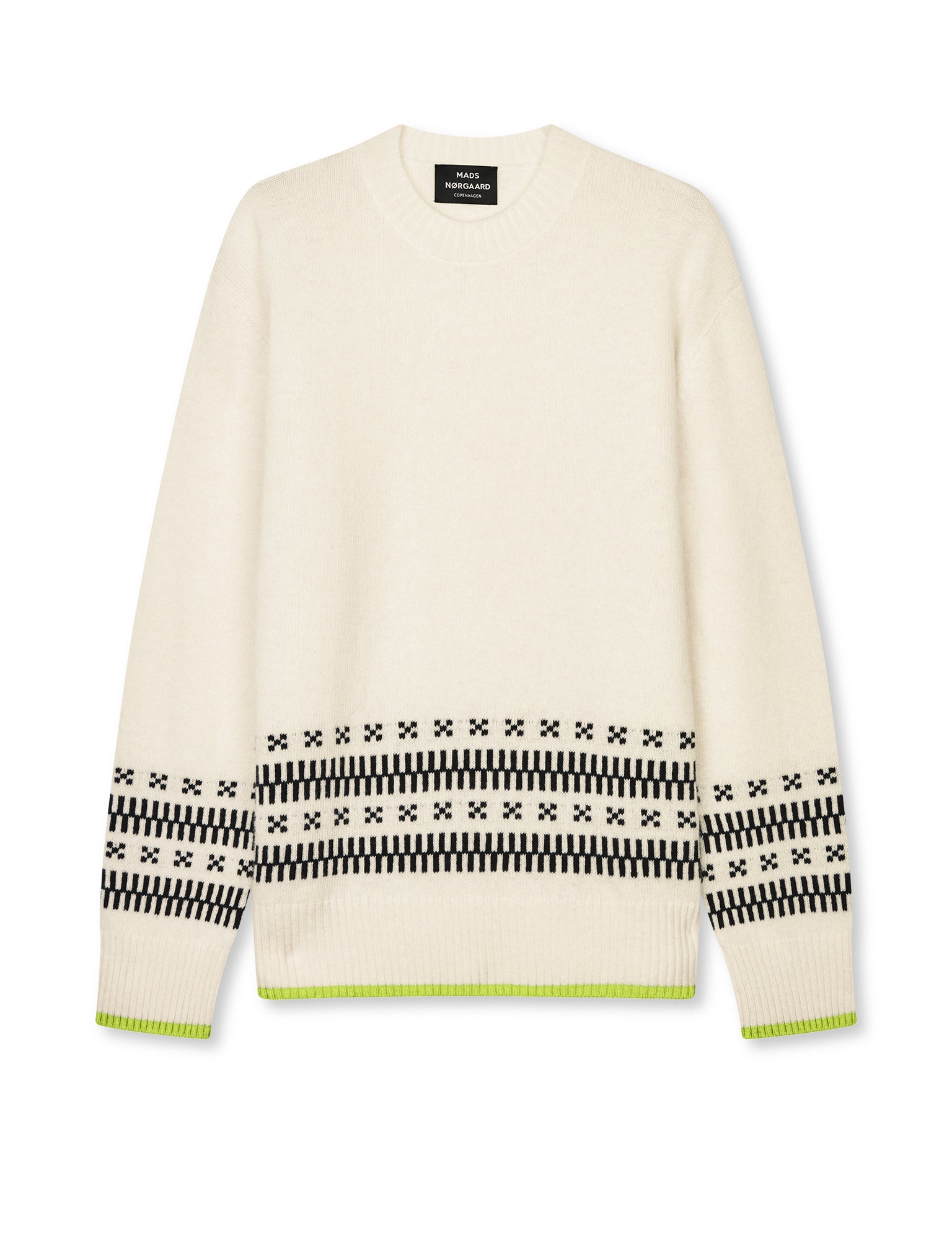 Kraftig og boxy striktrøje med hængende skuldre, nordisk mønster og neonkant.