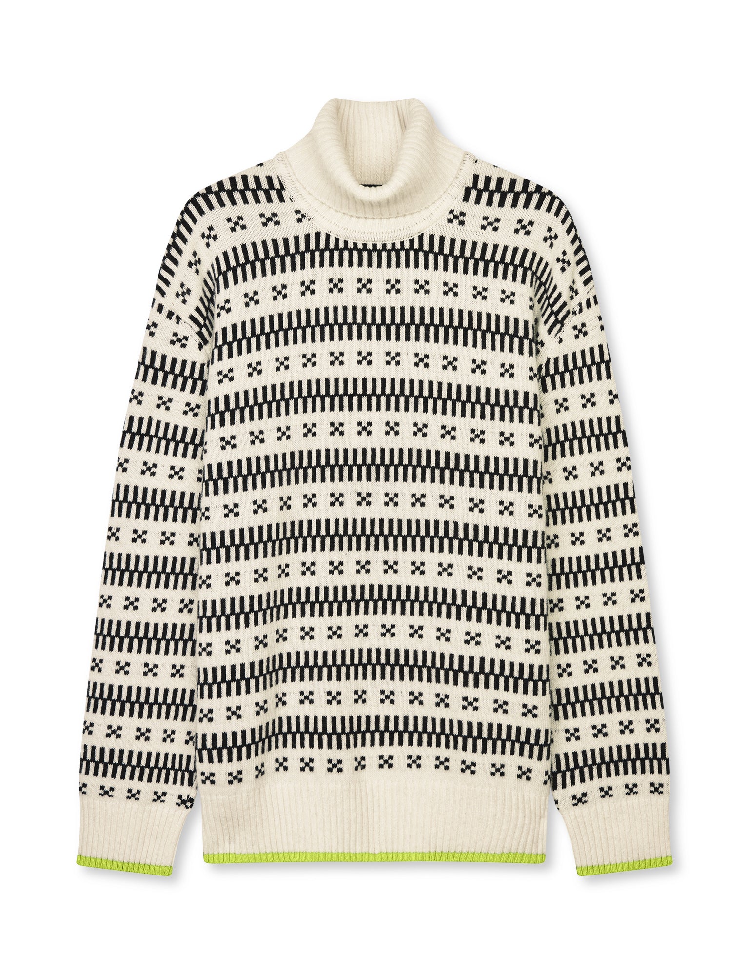 Kraftig og boxy striktrøje med hængende skuldre, rullekrave, nordisk mønster og neonkant.
