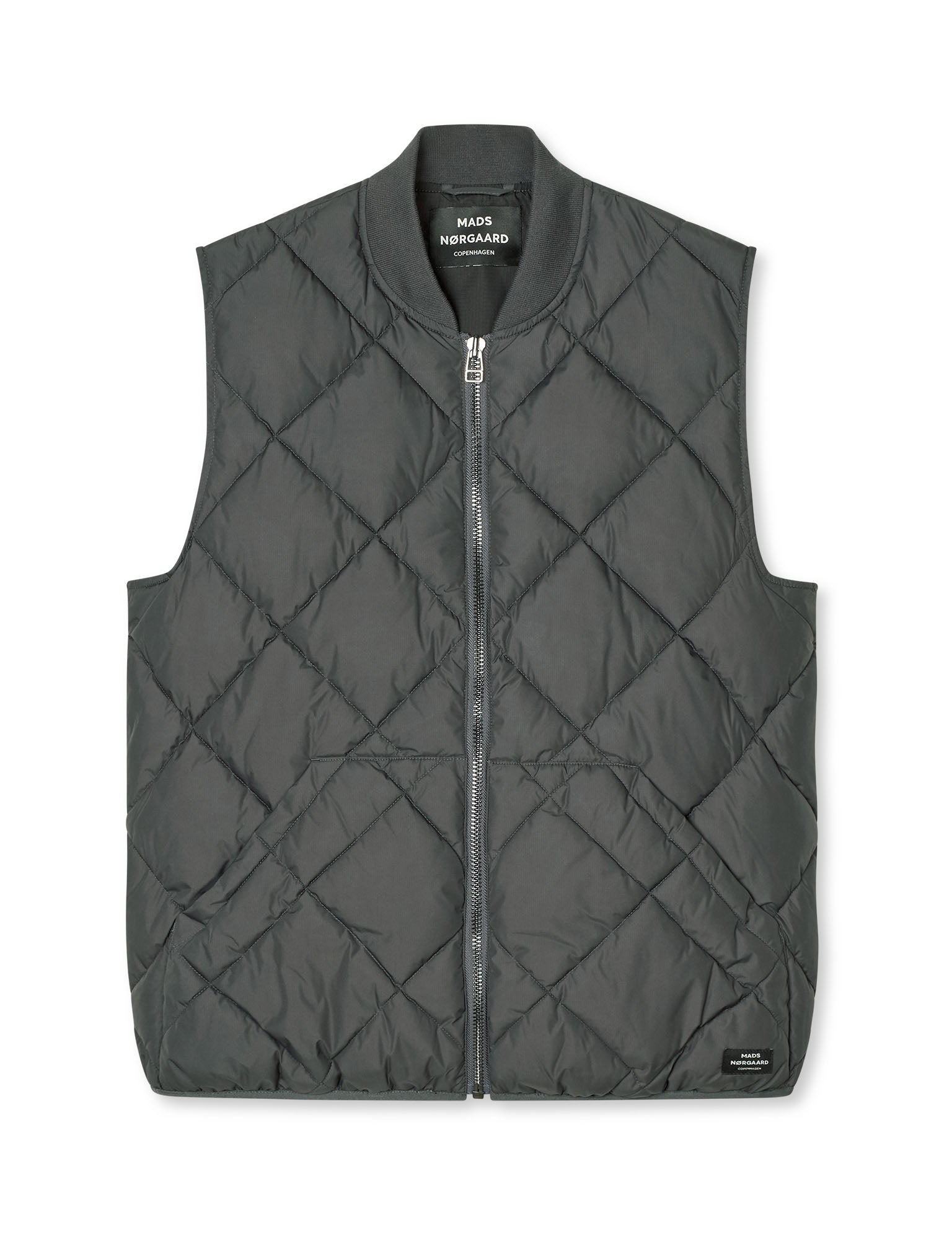 Blød, boxy termovest med lynlås, delt kængurulomme og rib ved halsen.