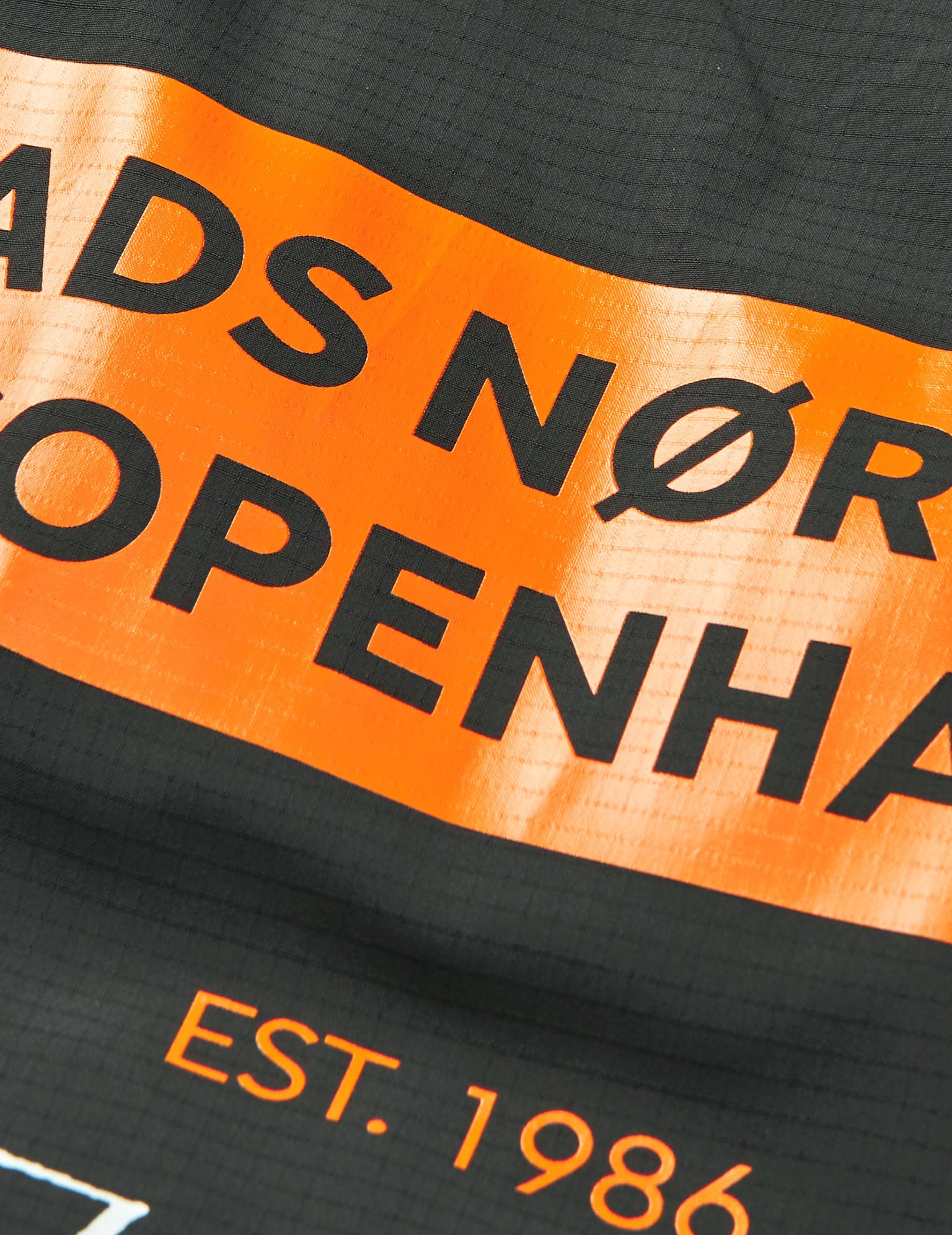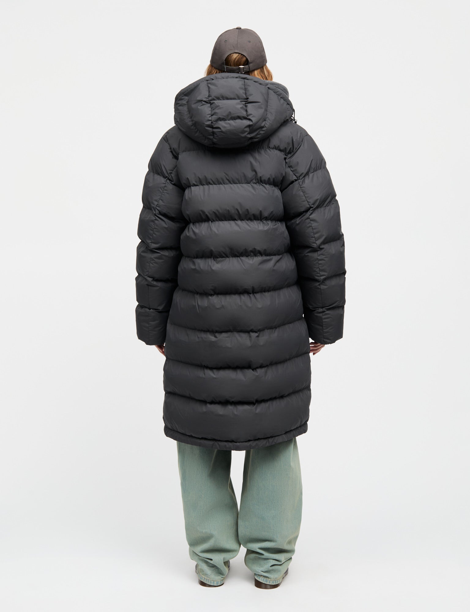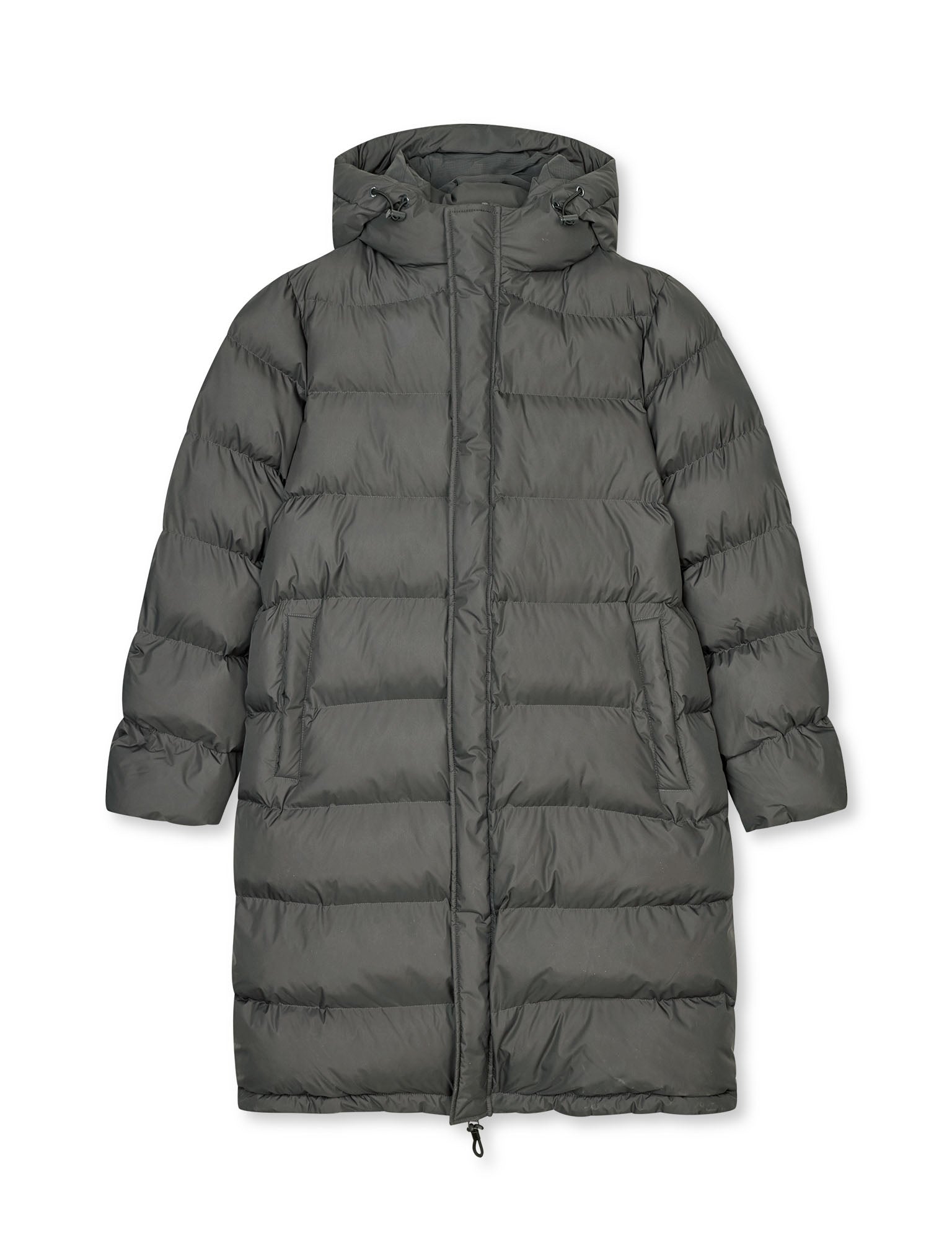 Lang, vandafvisende dynefrakke med beskyttet lukning, høj hals, stor hætte, stiklommer og elastisk snøre.