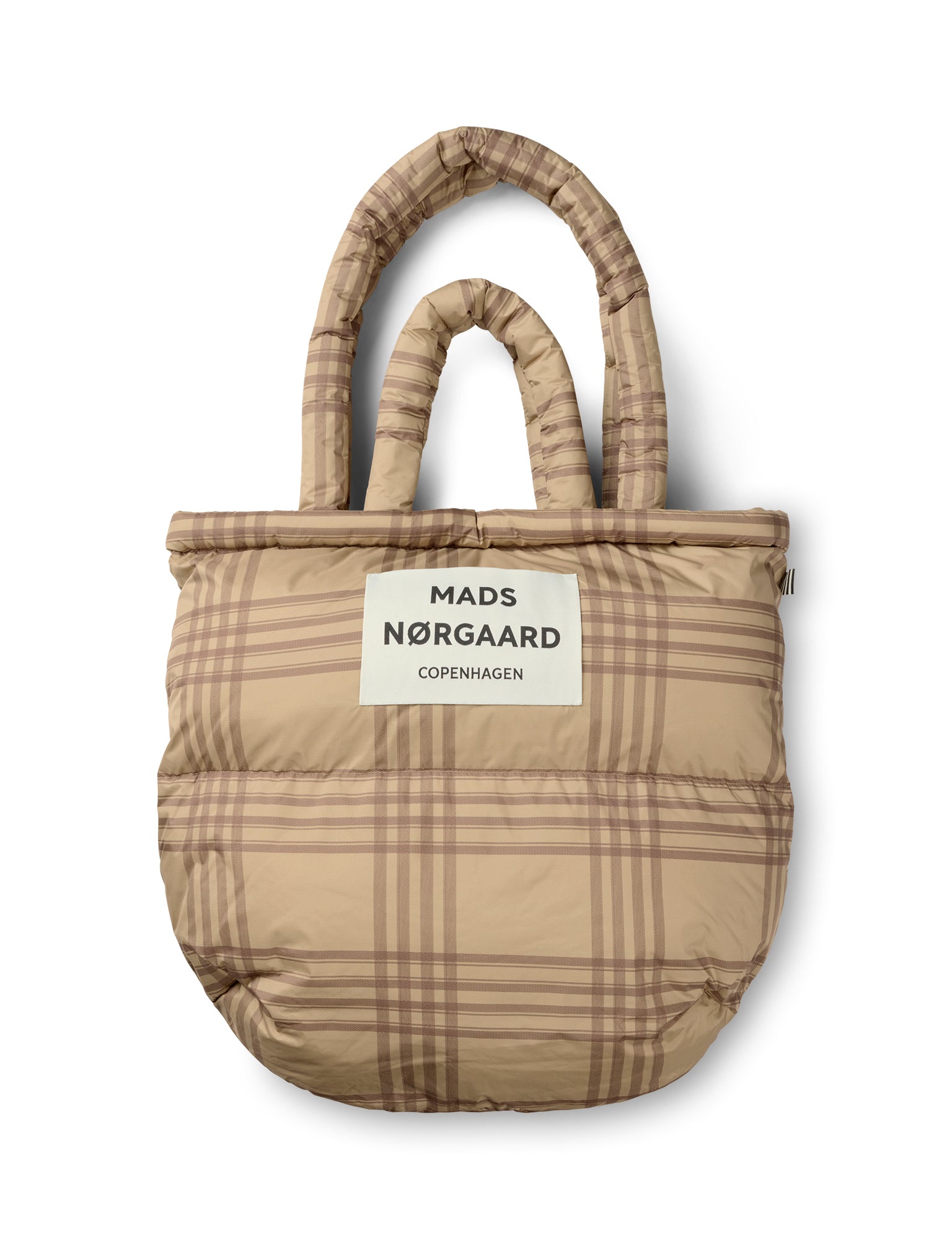 Shopper, der er blød som en pude og puffy og glat som en dynejakke og har hanke i to længder, inderlomme og logolabel.