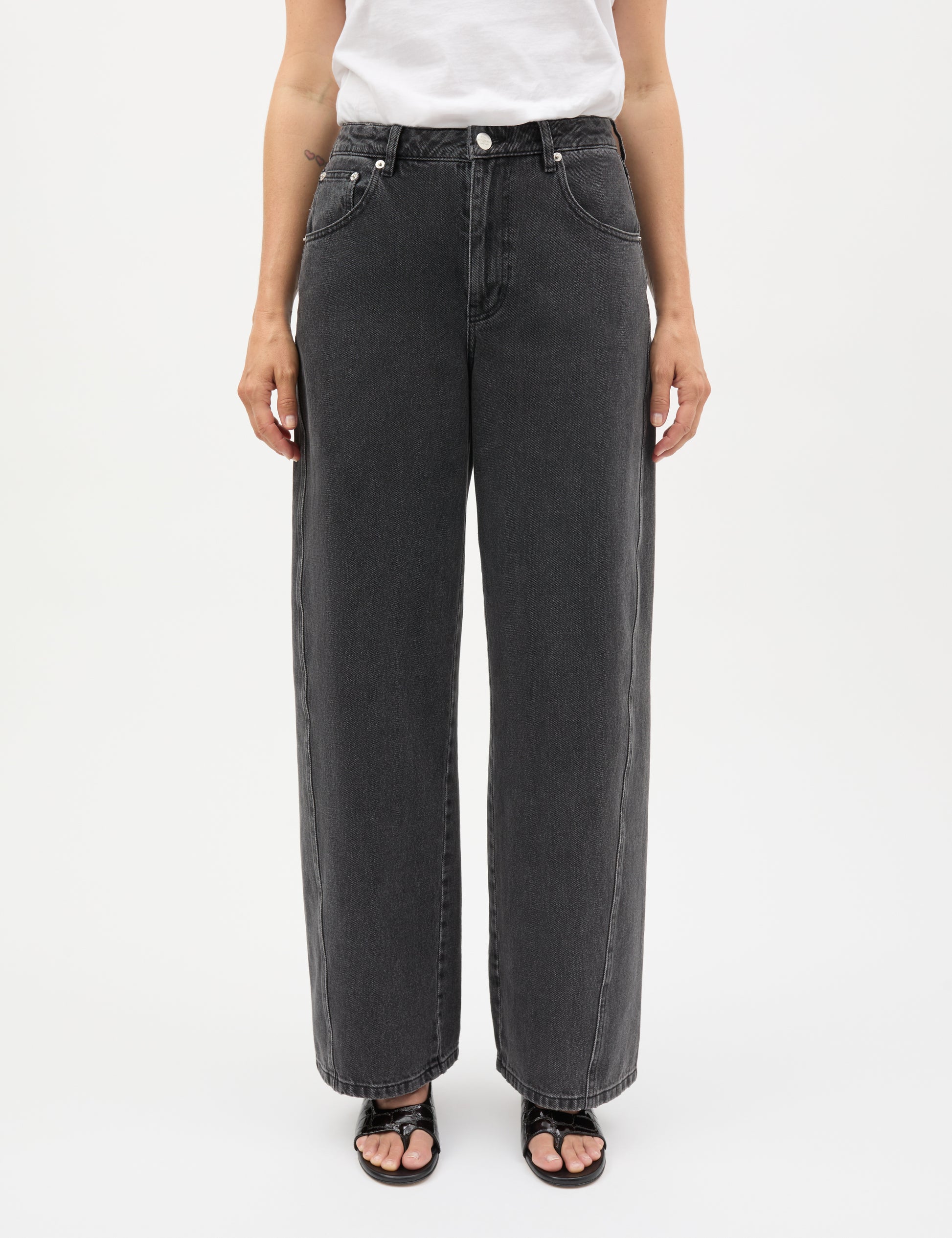 Klassiske Christel jeans med løs pasform, brede ben, bæltestropper i taljen samt for- og baglommer.