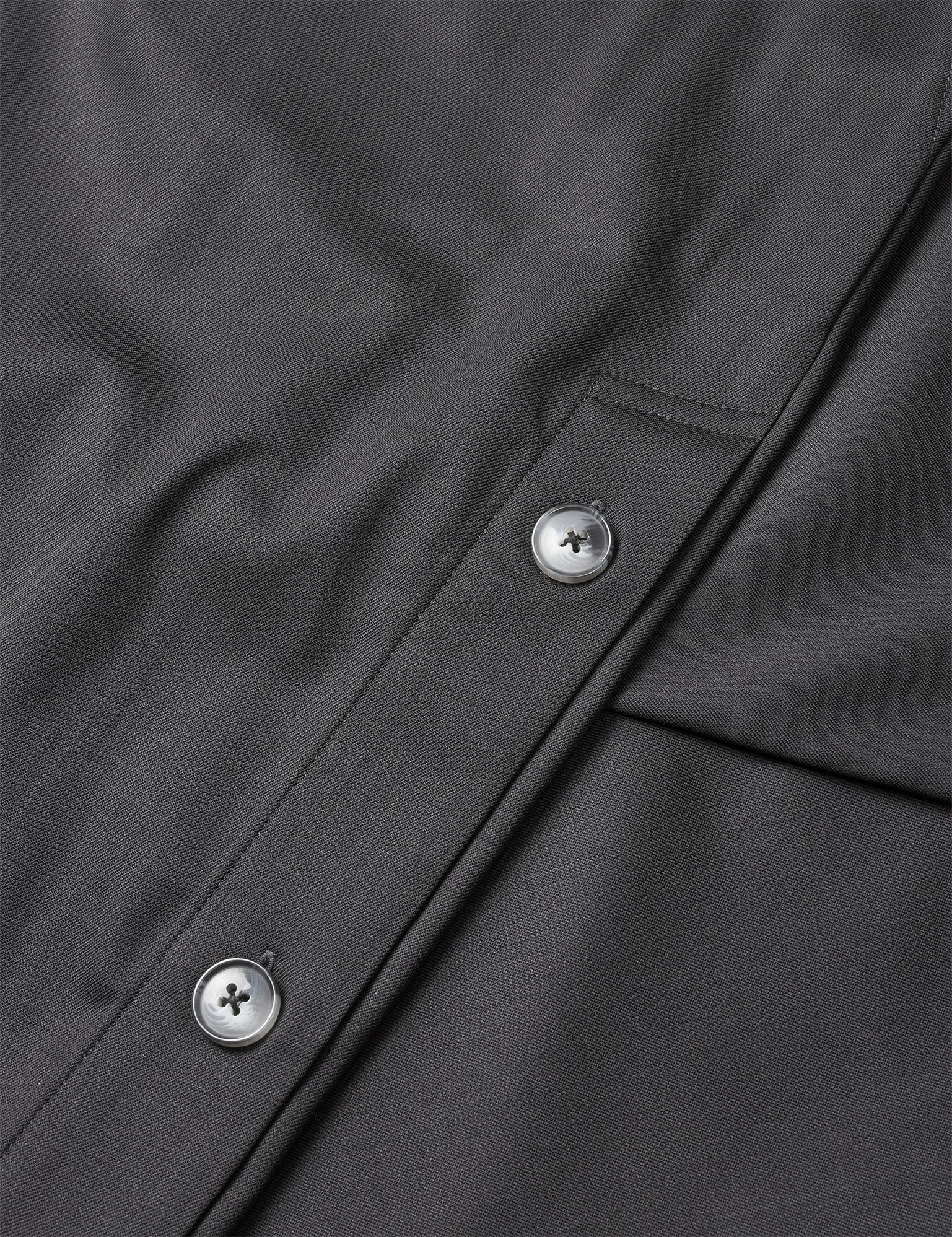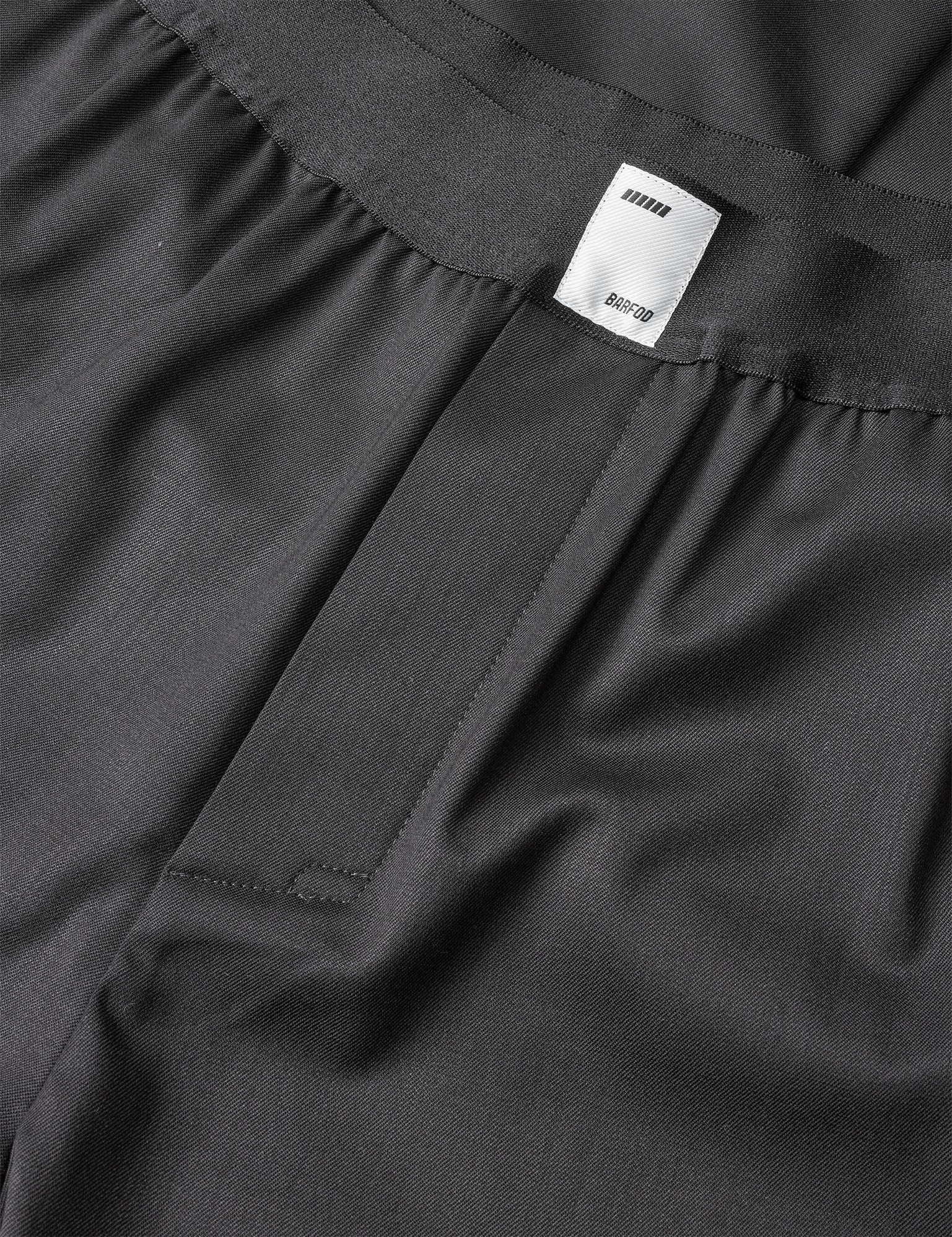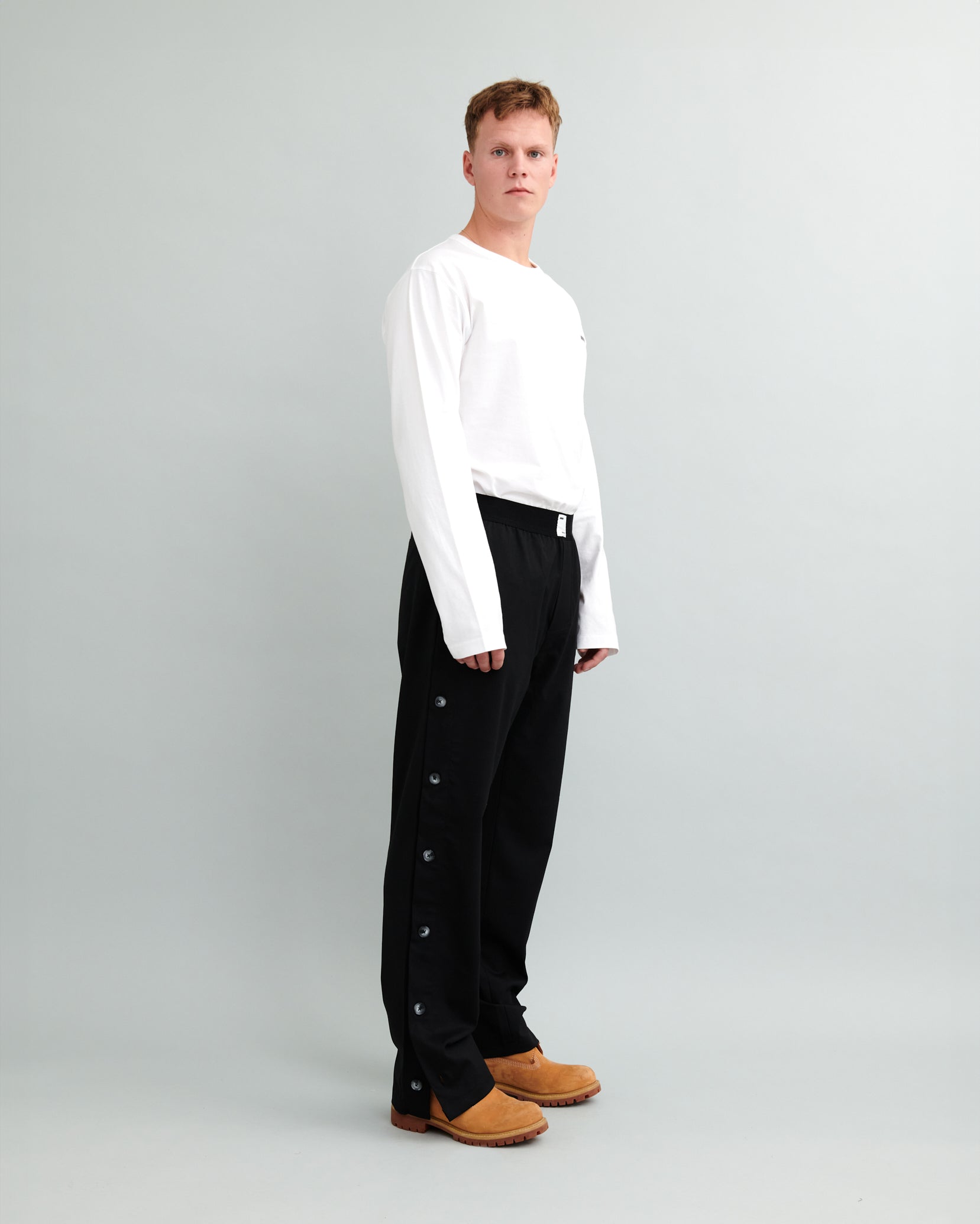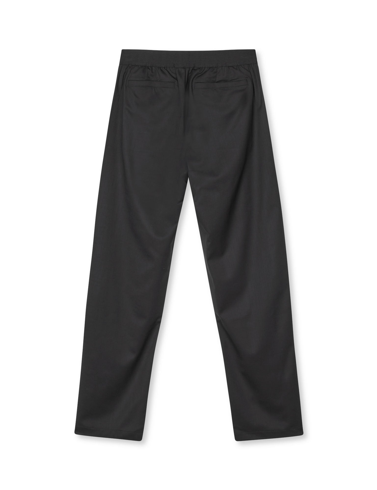 En nyfortolkning af den klassiske jakkesætsbuks, med elastisk i taljen og påsyet label foran. Bukserne er lavet med klassiske skrålommer ved sidesømmen og paspolerede baglommer. Knaplukning i sidesømmen, med mulighed for at åbne den nederste knap giver bukserne et sporty look. Gylpen er med knaplukning og bukserne har en lige pasform.