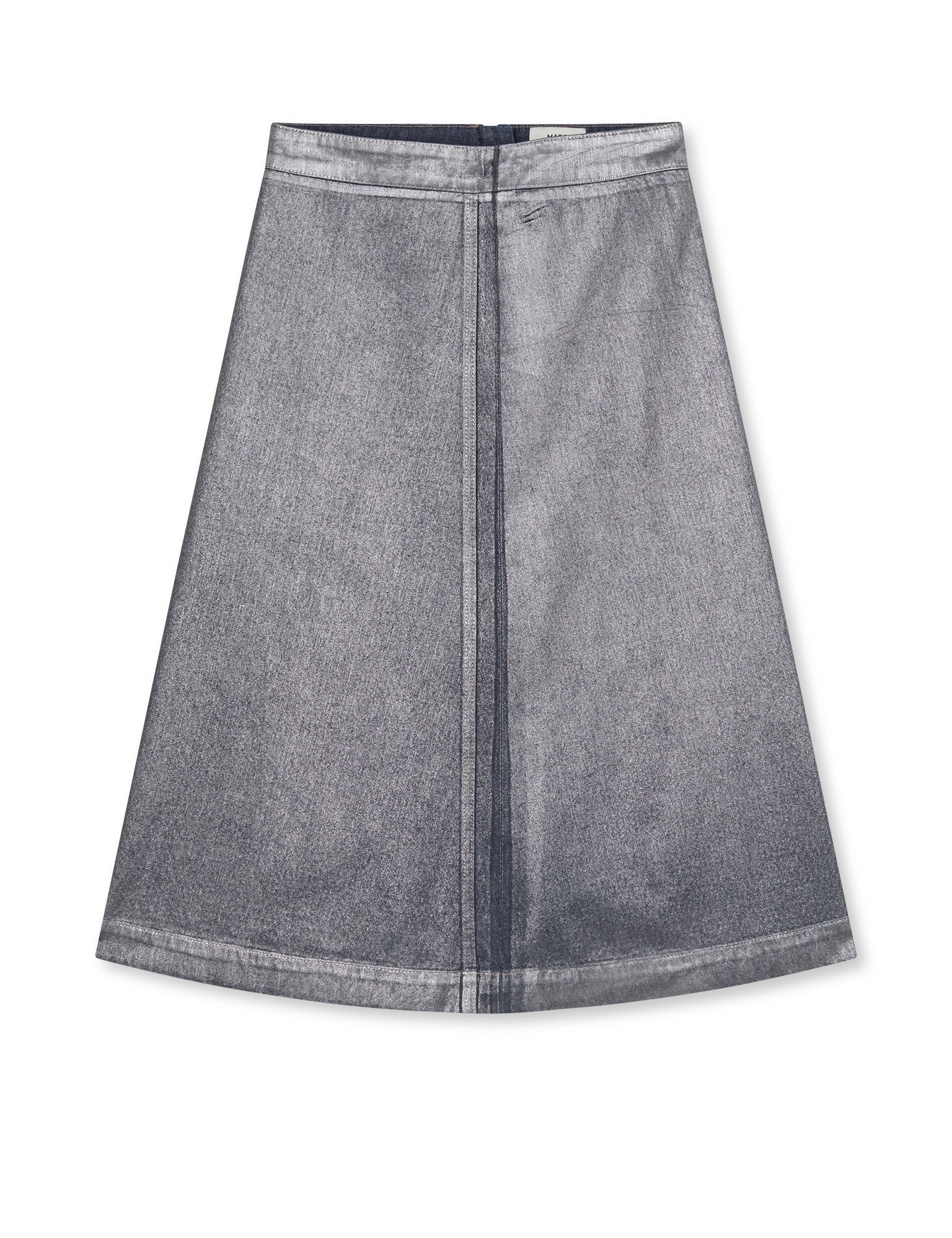 A-formet, læglang og let denimnederdel med høj talje, lommer, fast linning og lynlås bagpå.