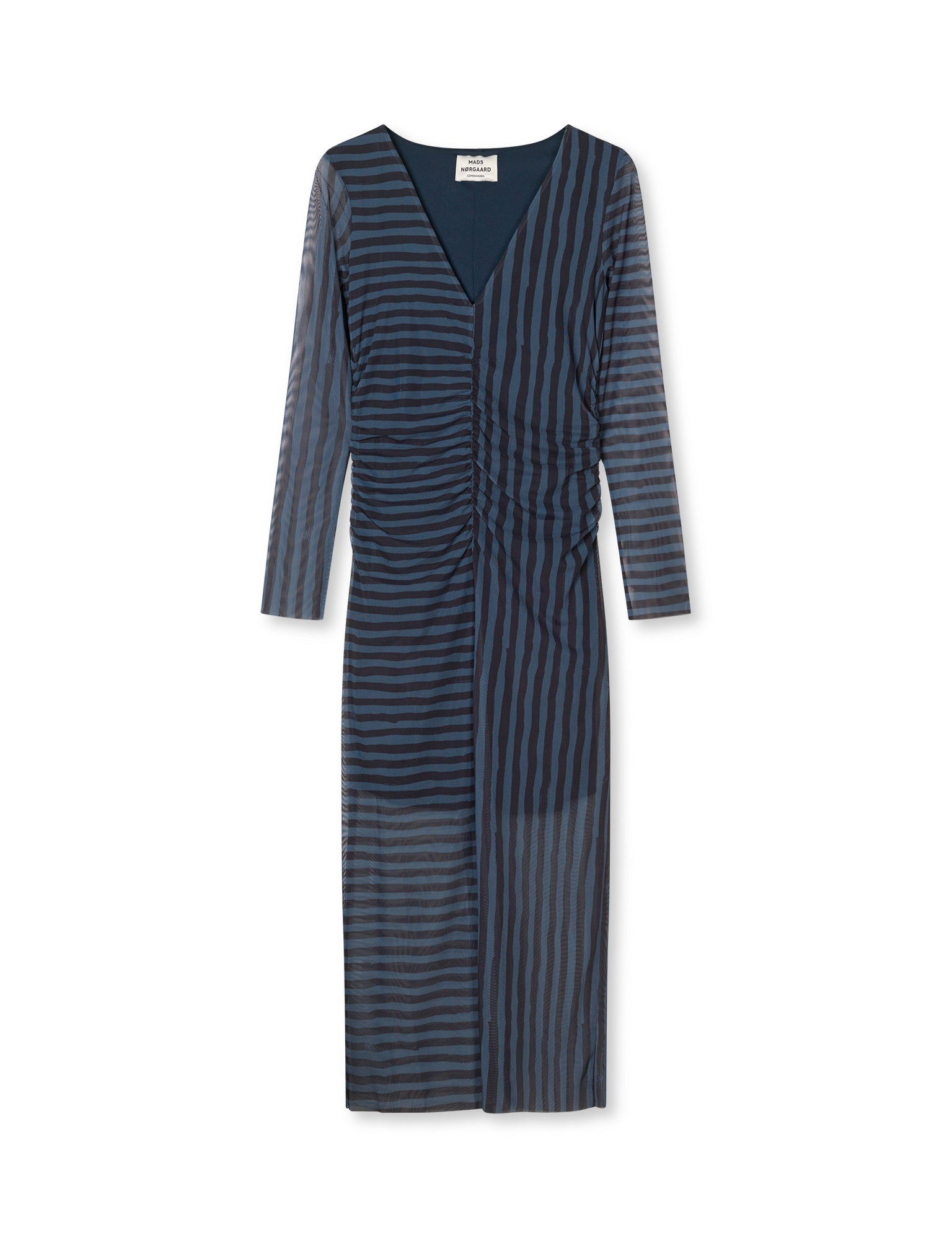 Tætsiddende og stretchy net-kjole med lange ærmer, v-udskæring og lårkort underkjole.