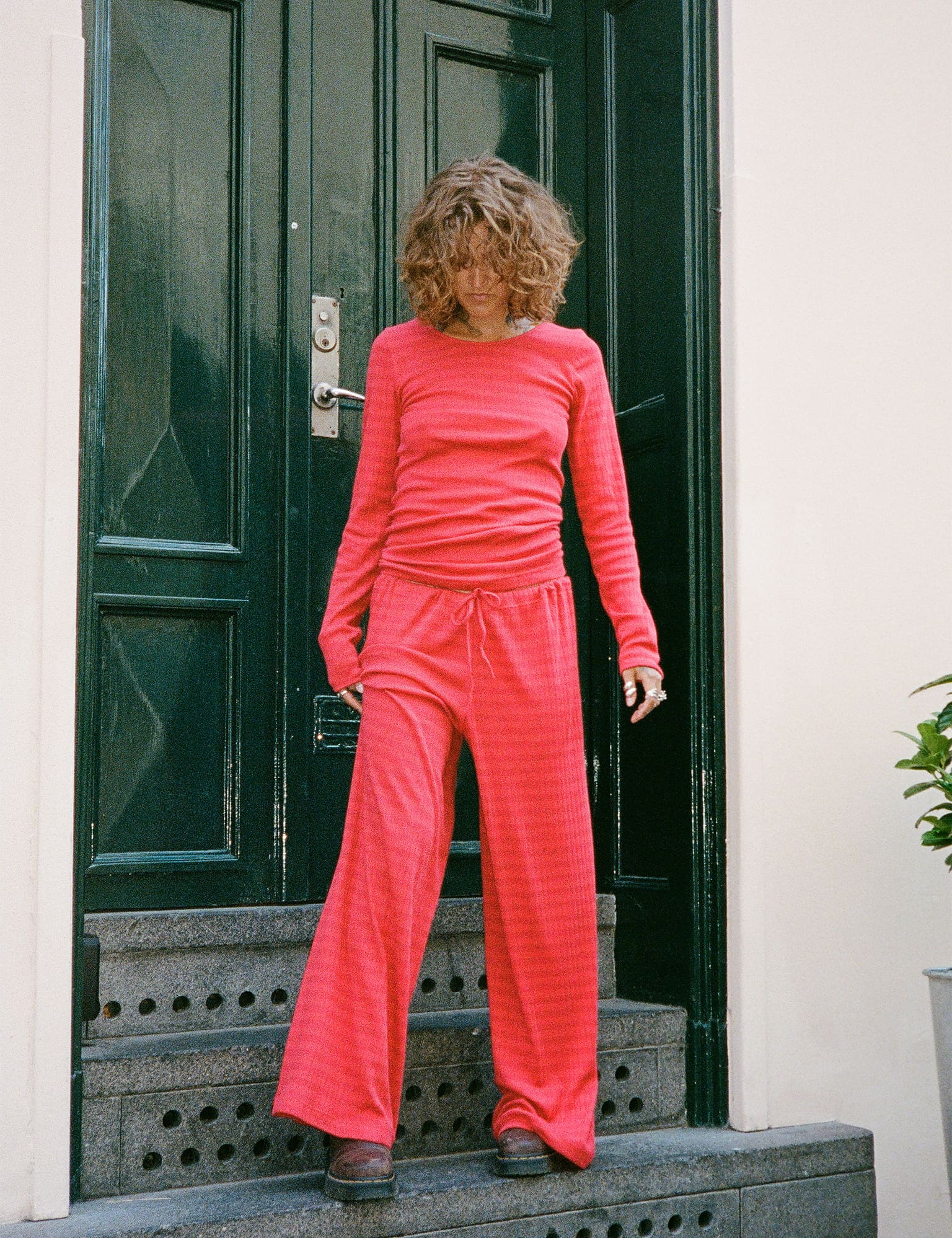 NPS Nova Pants Broadway Colour er et par bukser uden sidesøm, med en løs pasform og snørelukning. Bukserne er syet på vores systue i Korsør og stoffet bliver strikket i Ikast af 100% BCI bomuld.  NPS Nova Pants Broadway Colour er one size, men kan fås i to forskellige længder.  Str. 2 er ca. 10 cm længere end str. 1.