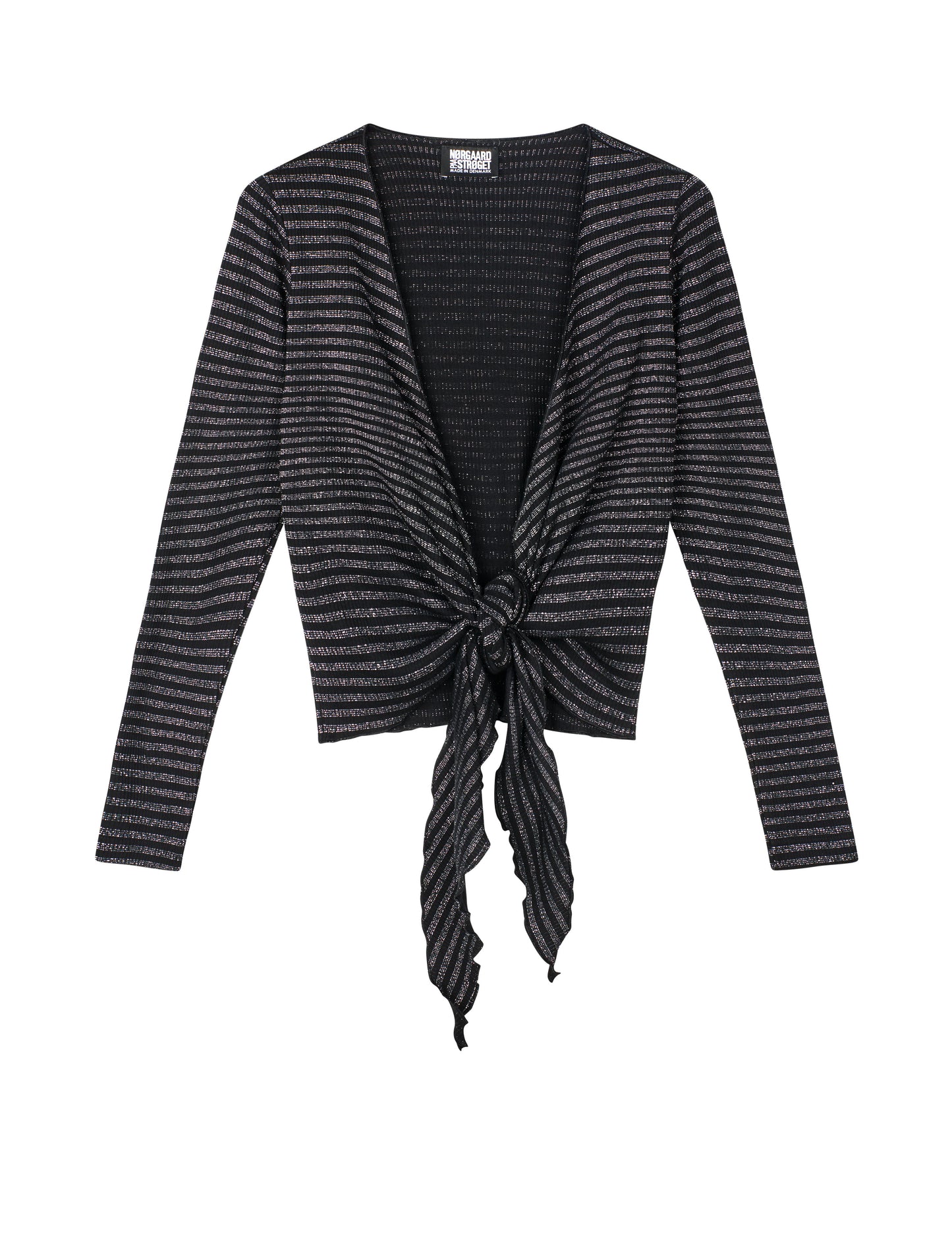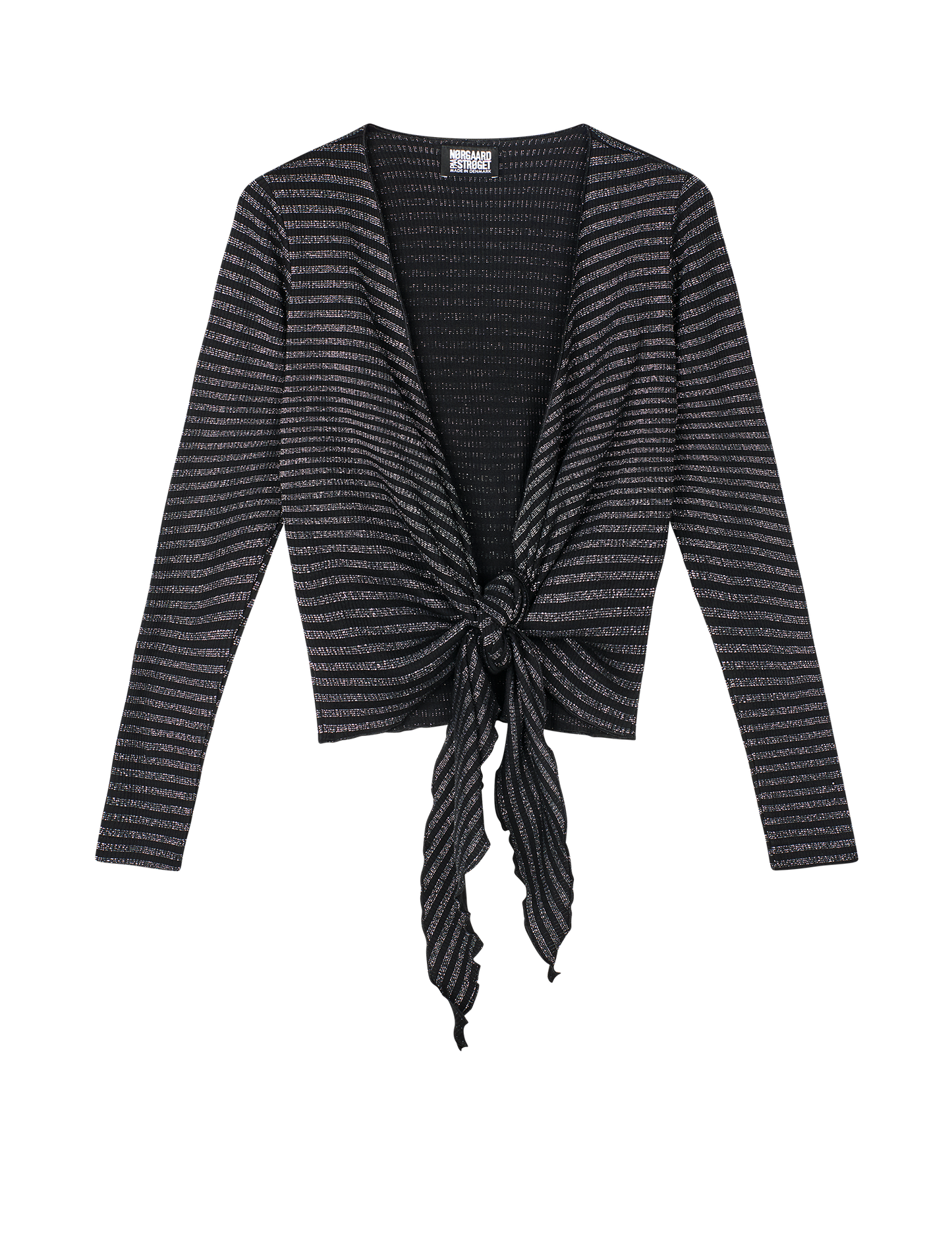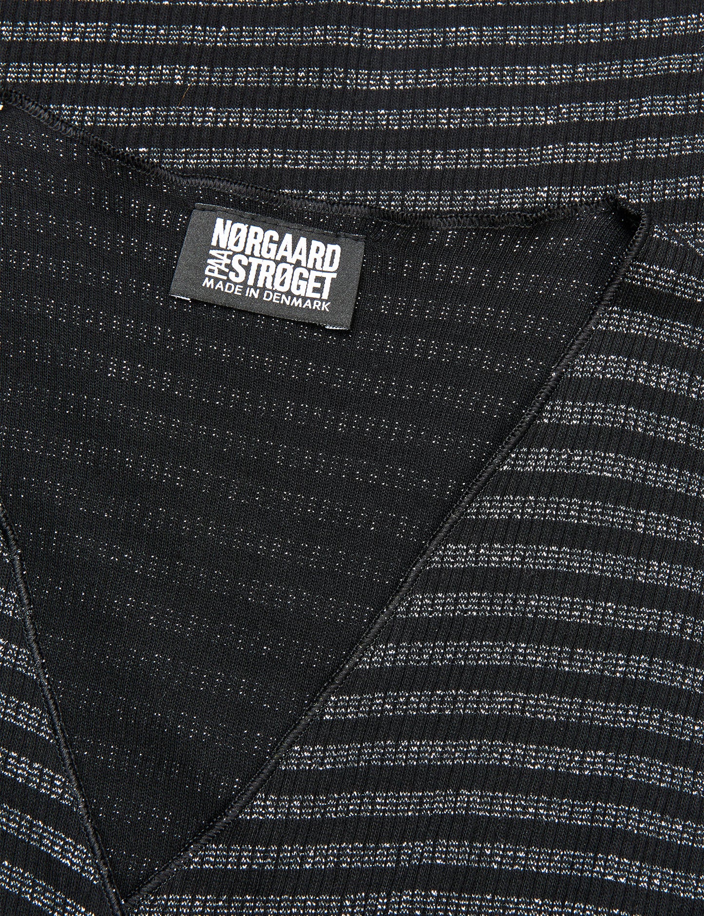 NPS Wrap Top Glam er slå-om trøje i glitter, som kan bindes under brystet eller på ryggen. Blusen er designet i 90’erne og er strikket og syet i Danmark.