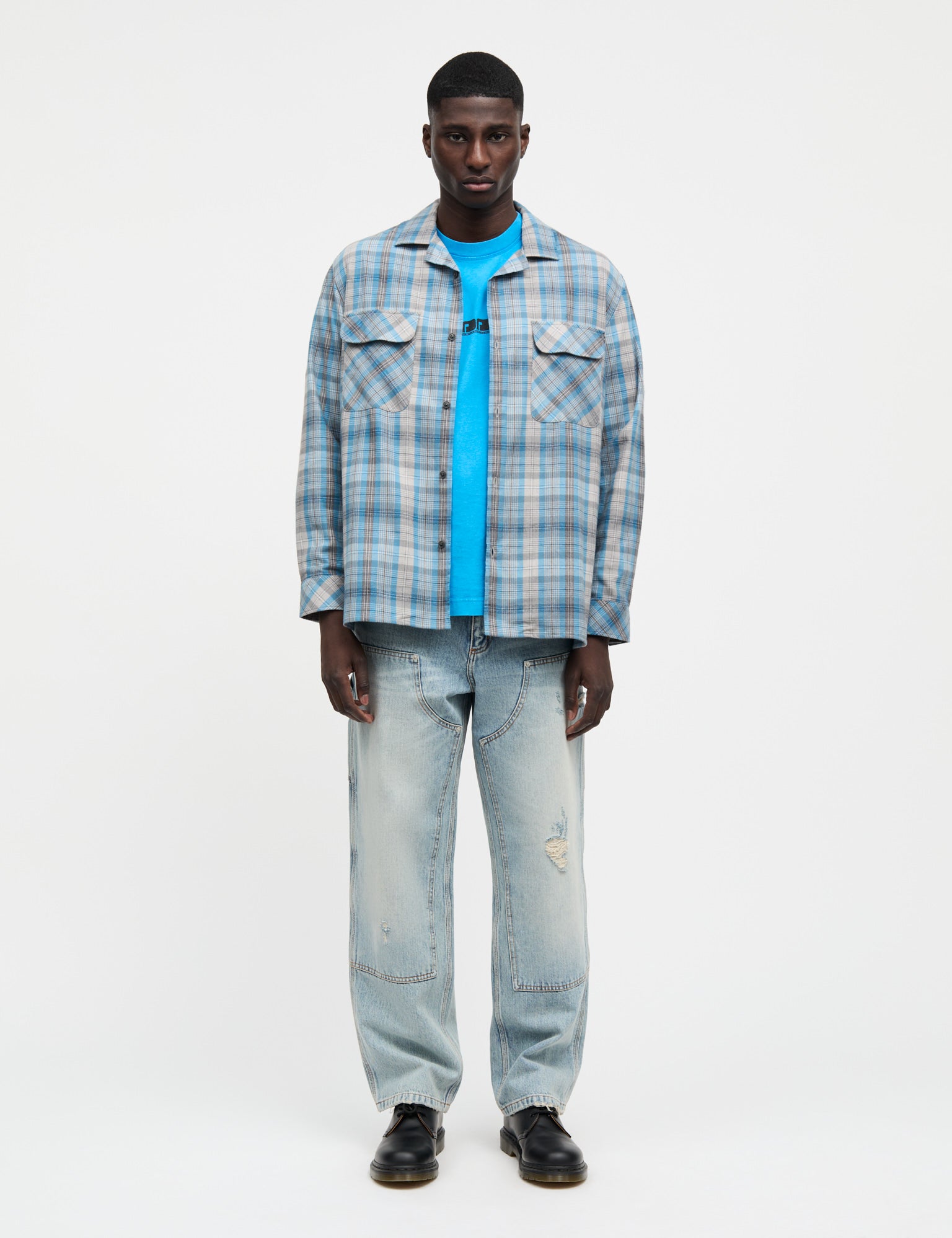 Løstsiddende cargojeans i tung denim med brede ben, stiklommer og baglommer, forstærkede knæ og lynlås og knap.